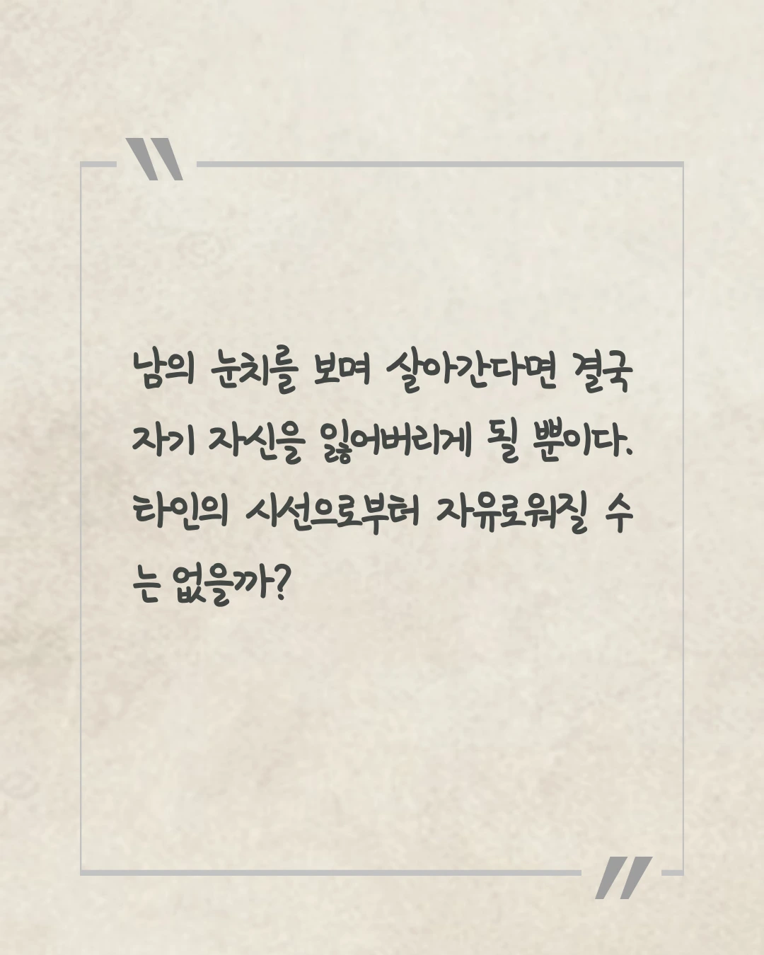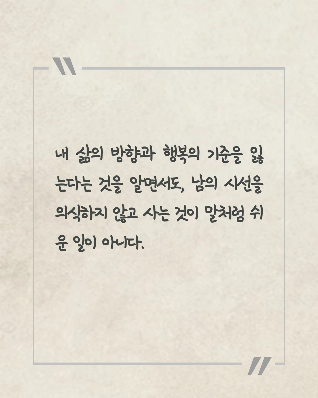 내 삶의 방향과 행복의 기준을 잃는다는 것을 알면서도, 남의 시선을 의식하지 않고 사는 것이 말처럼 쉬운 일이 아니다.