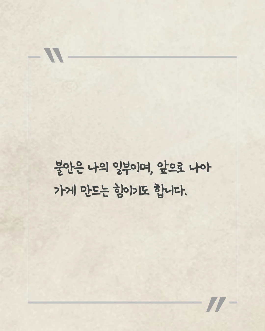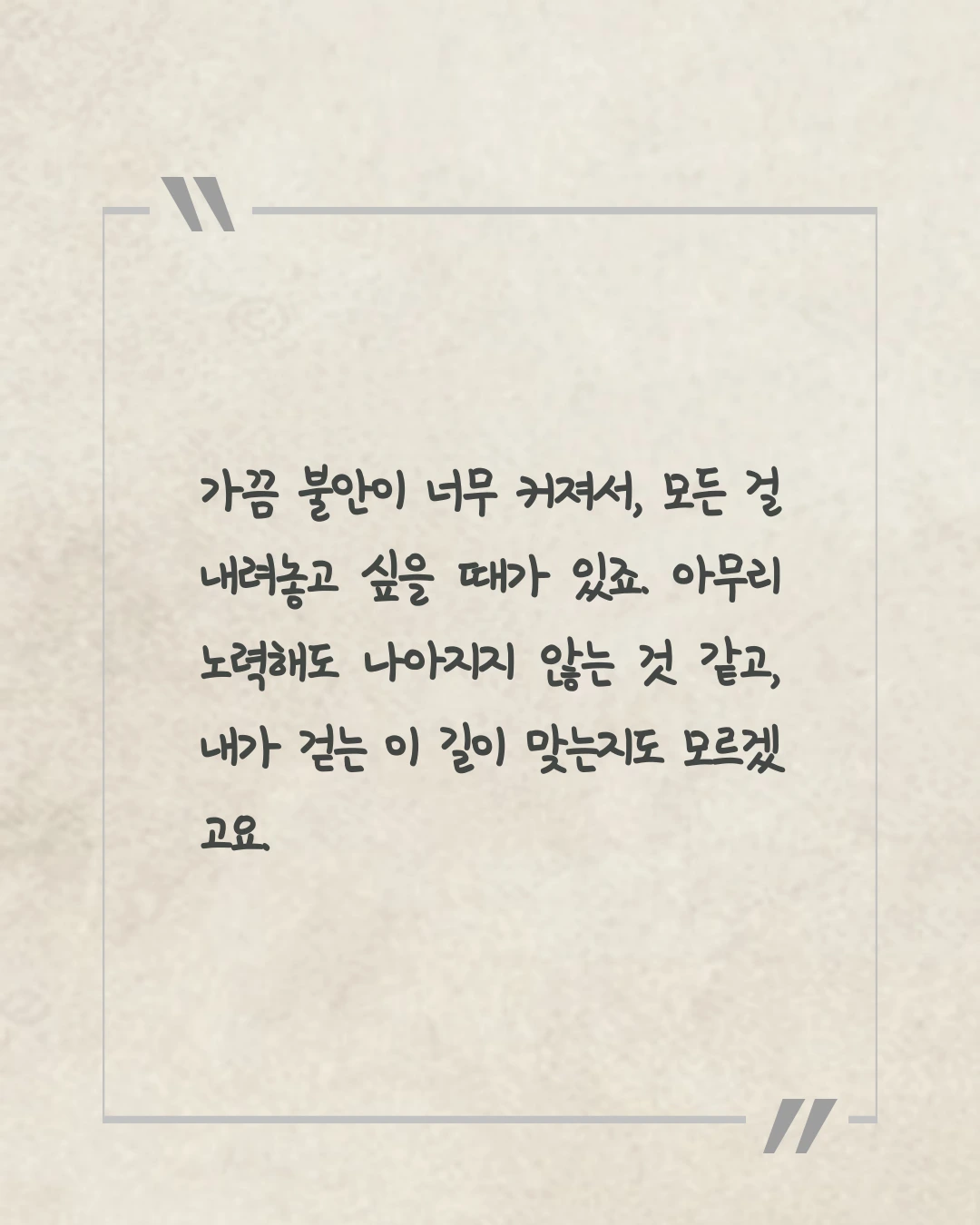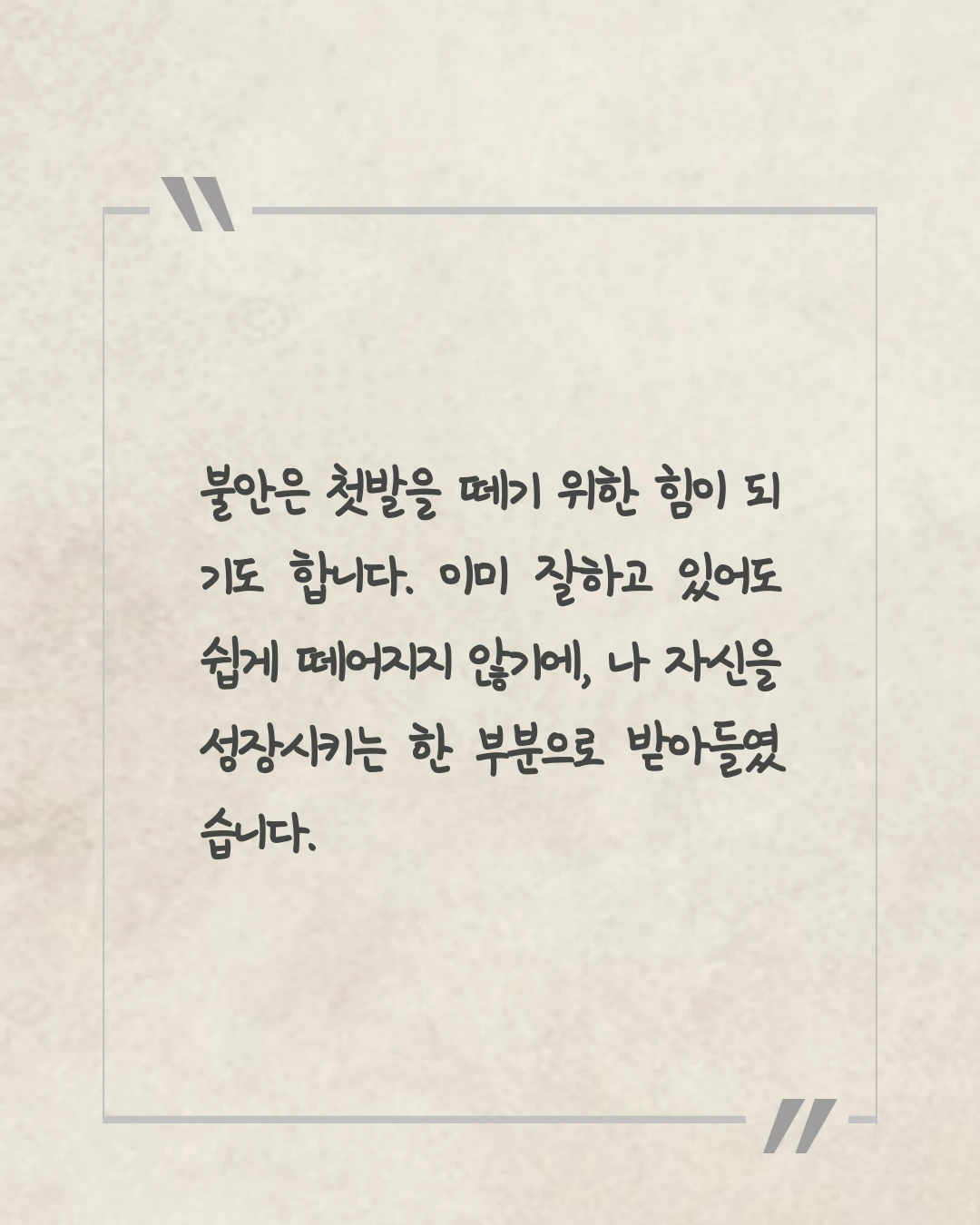 SNS 속 누군가는 나보다 앞서 있는 것 같고, 주변 사람들의 속도는 나의 성장보다 빠른 것 같아, ‘나는 잘하고 있는 걸까?’라는 의심이 자꾸만 달라붙습니다. 가끔 그 불안이 너무 커서, 모든 걸 내려놓고 싶을 때가 있죠. 아무리 노력해도 나아지지 않는 것 같고, 내가 걷는 이 길이 맞는지도 모르겠고요. 하지만 그 감정이 없었다면, 지금처럼 더 나은 방향으로 나아가기 위해 애쓰지 않았을 것입니다. 불안은 첫발을 떼기 위한 힘이 되기도 합니다. 이미 잘하고 있어도 쉽게 떼어지지 않기에, 나 자신을 성장시키는 한 부분으로 받아들였습니다. 불안은 나의 일부이며, 앞으로 나아가게 만드는 힘이기도 합니다.