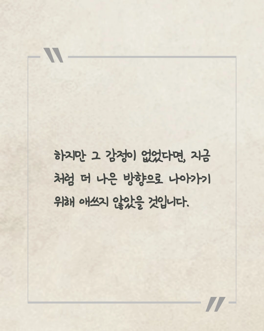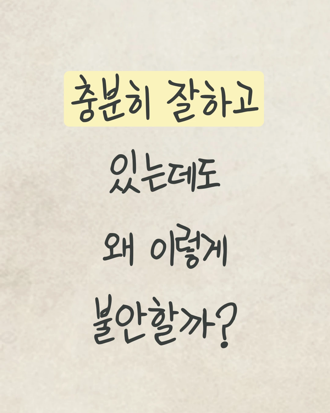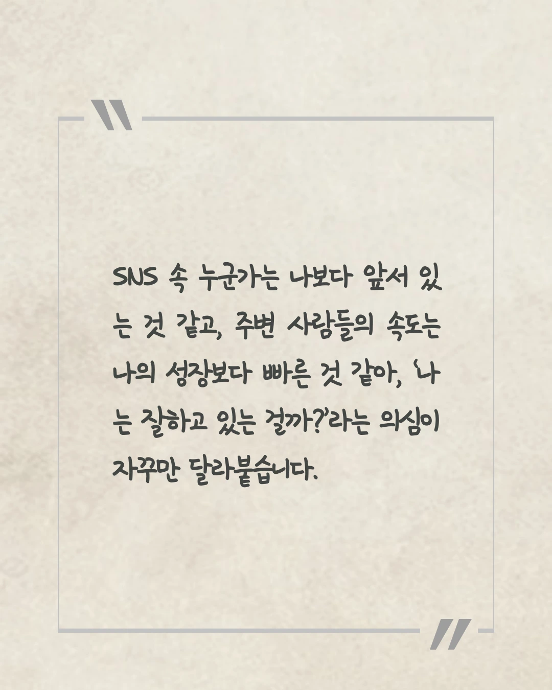 SNS 속 누군가는 나보다 앞서 있는 것 같고, 주변 사람들의 속도는 나의 성장보다 빠른 것 같아, ‘나는 잘하고 있는 걸까?’라는 의심이 자꾸만 달라붙습니다. 가끔 그 불안이 너무 커서, 모든 걸 내려놓고 싶을 때가 있죠. 아무리 노력해도 나아지지 않는 것 같고, 내가 걷는 이 길이 맞는지도 모르겠고요. 하지만 그 감정이 없었다면, 지금처럼 더 나은 방향으로 나아가기 위해 애쓰지 않았을 것입니다. 불안은 첫발을 떼기 위한 힘이 되기도 합니다. 이미 잘하고 있어도 쉽게 떼어지지 않기에, 나 자신을 성장시키는 한 부분으로 받아들였습니다. 불안은 나의 일부이며, 앞으로 나아가게 만드는 힘이기도 합니다.