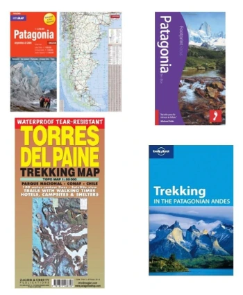 왼쪽 위에서부터 시계방향으로 Patagonia Infomap in English, Patagonia (Footprint Focus), Lonely Planet Trekking in the Patagonian Andes, Torres del Paine Waterproof Trekking Map이다.