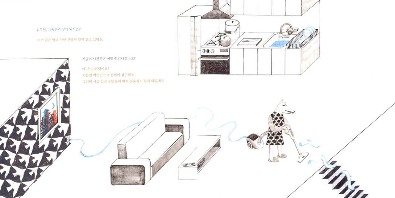 <L부인과의 인터뷰>는 결혼과 육아로 경력이 단절된 여성을 늑대 부인으로 설정해 인터뷰 형식으로 구성한 그림책이다. 결혼 전 가졌던 직업을 사냥에, 꿈을 향해 정진해 나아갔던 시절을 야생에 비유했다.