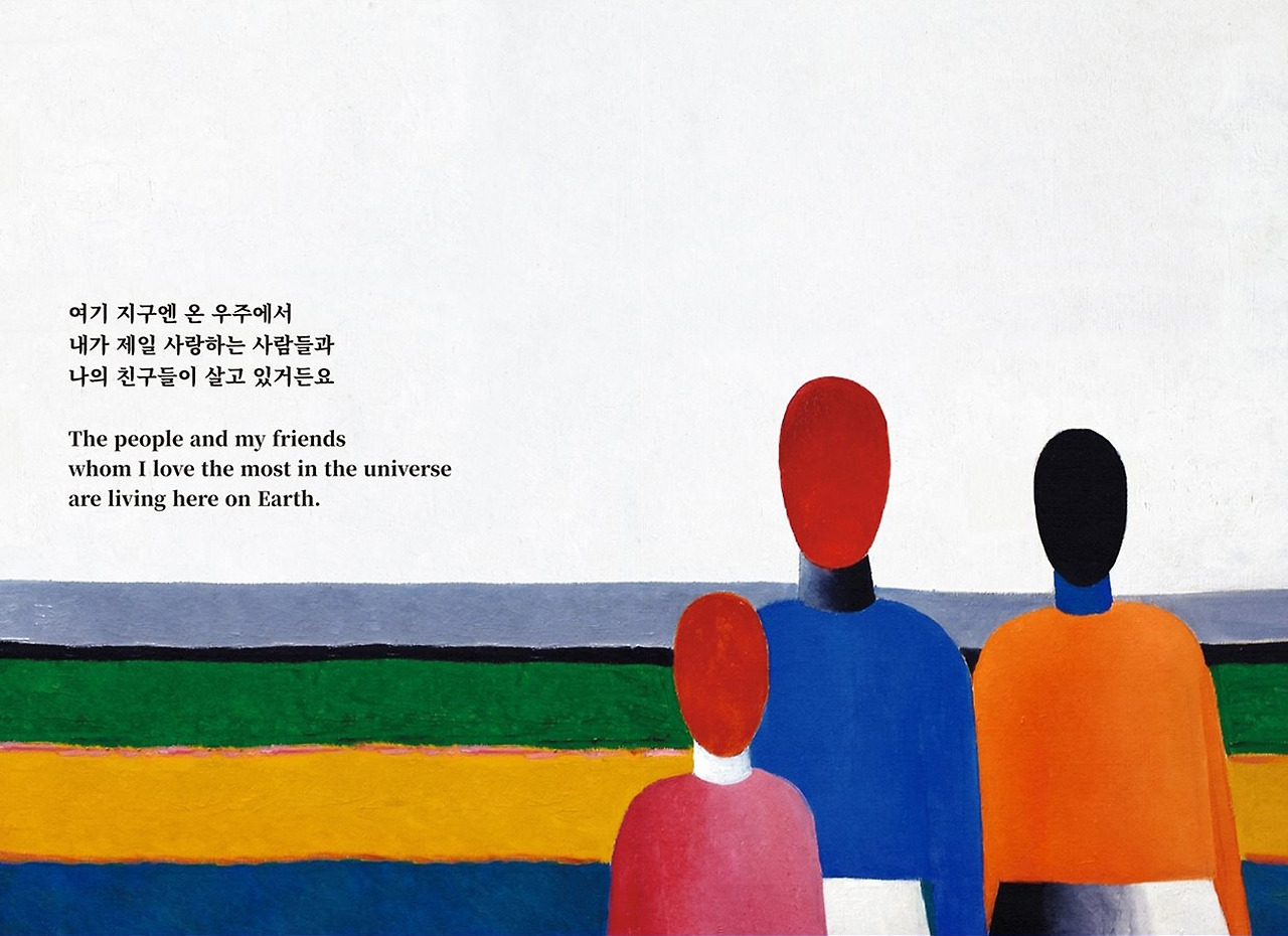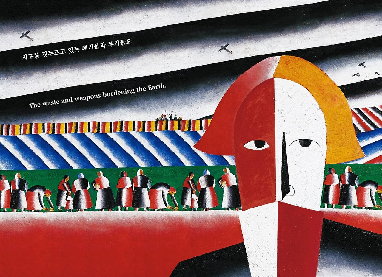 [푸른빛의 소녀가]는 시인의 첫 번째 시 그림책이다. 저 먼 행성에서 불시착한 푸른빛의 소녀와 지구별 시인의 가슴 시린 이야기를 담고 있다. 그림은 우크라이나 태생 러시아 작가 말레비치가 그렸다. 우크라이나 태생 러시아 작가라니. 책이 출판된 게 2020년 11월 3일이니 적어도 2020년 11월 이전에 이 그림들을 그렸겠지? 말레비치는 전쟁을 묘사한 그림을 그리며 2022년의 전쟁을 예상했을까?