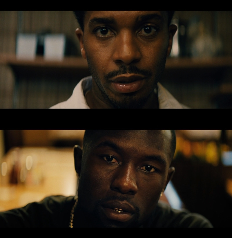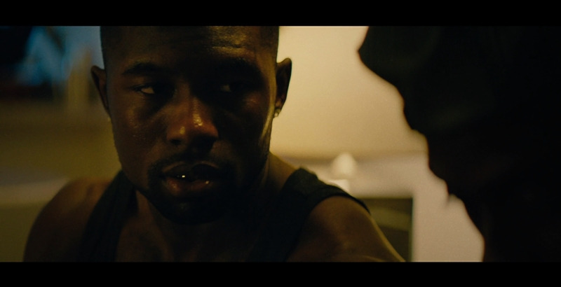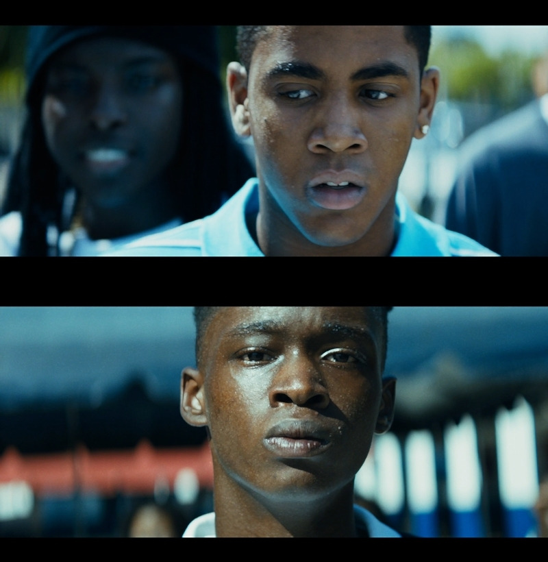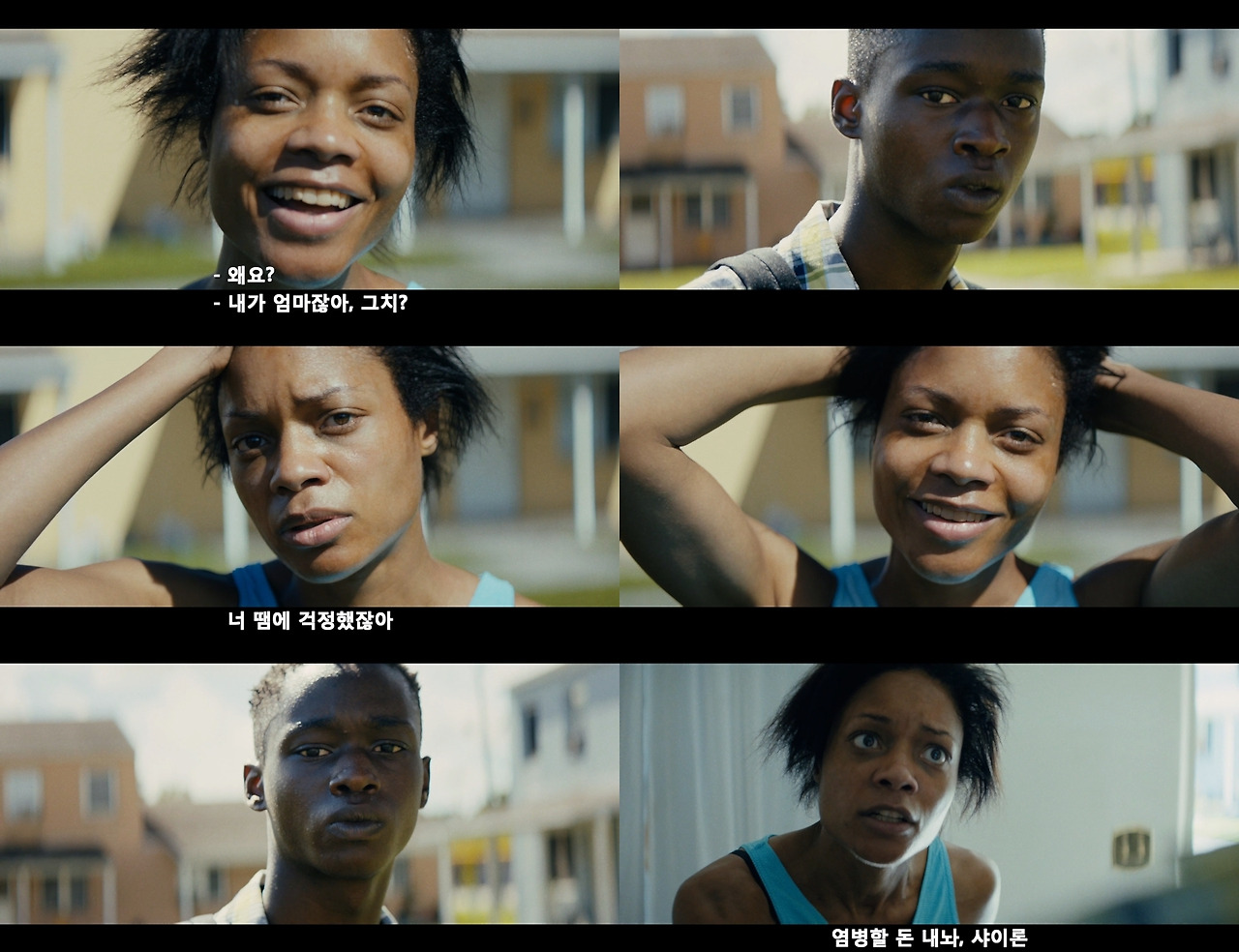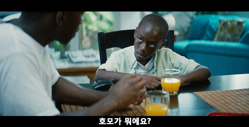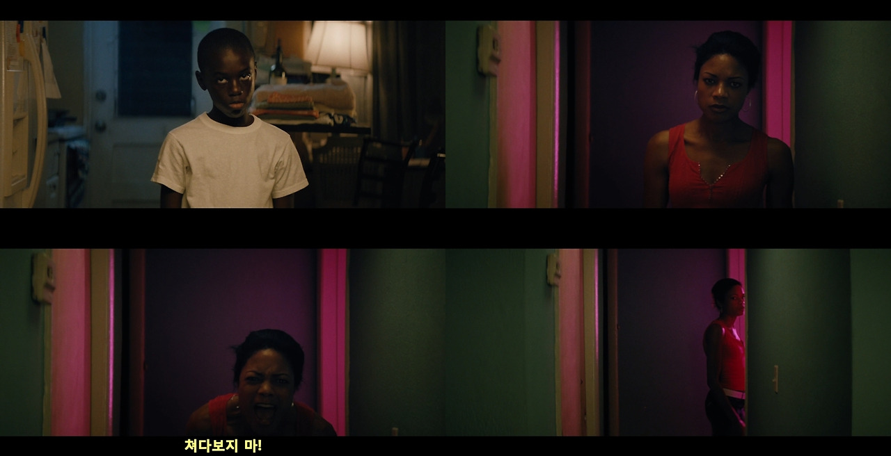이러한 의문은 좀처럼 풀리지 않다가 비로소 풀리기 시작한다. 영화 속 마약 판매상으로 등장했던 후안의 고객이 바로 샤이론의 엄마였던 것이다. 후안에게 마약을 구입하여 흡입한 엄마는 집으로 돌아와 폭력적이고 강압적인 모습을 표출하기 시작한다. 하지만 샤이론에게 이러한 행위가 처음이 아니었던 것이 분명하다. 왜냐하면 샤이론은 늘 고개를 푹 숙인 채 눈을 치켜뜨고 있는 얼굴 표정을 늘 연출하였는데, 이 표정의 근원적인 뿌리가 바로 이러한 엄마의 행태 때문인 것이다.