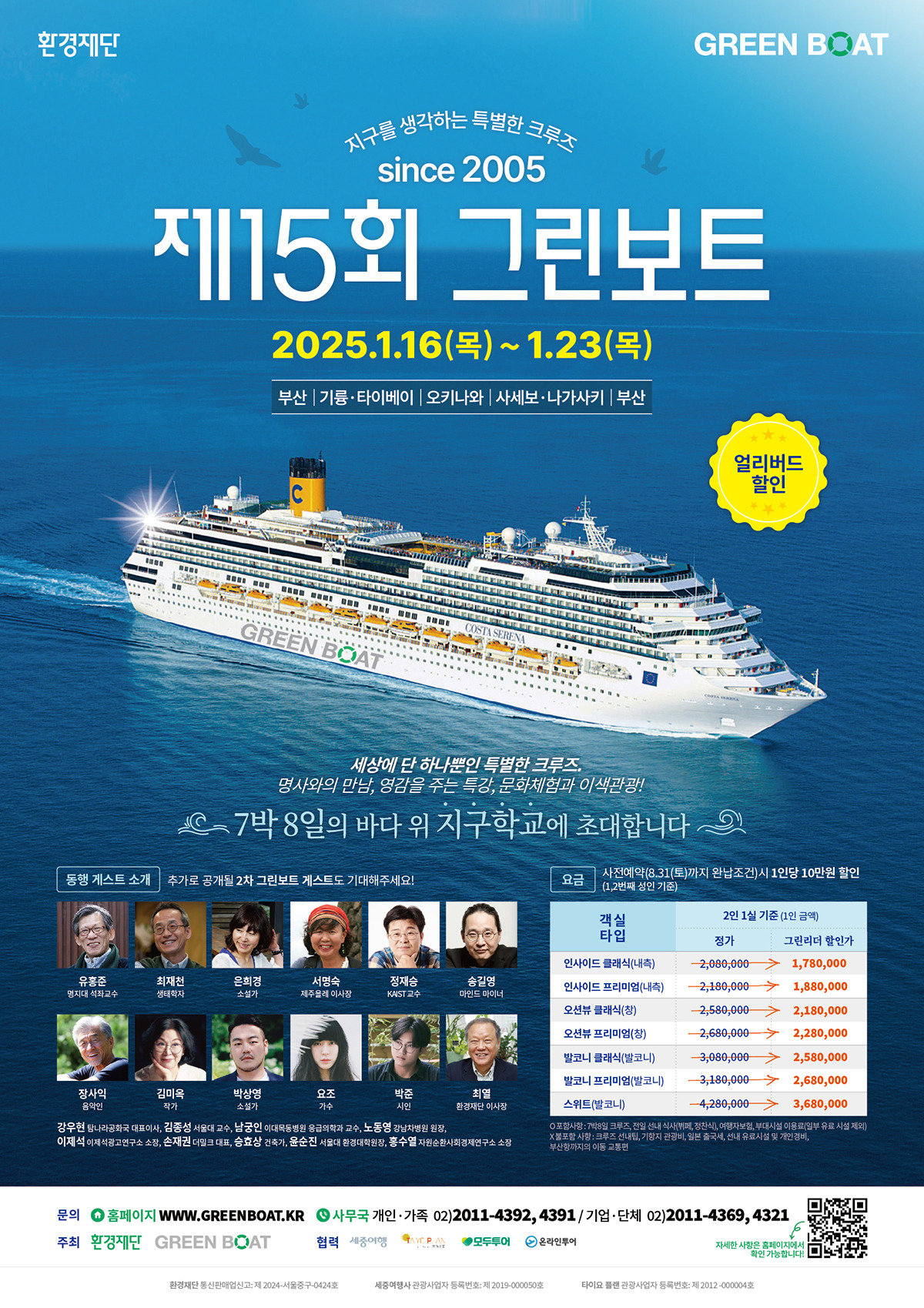 무엇보다 일반인들의 관심을 끄는 다양한 분야의 셀럽들이 승선해 함께 여행할 수 있다는 사실은 그린보트의 매력을 더해 준다. 익숙한 얼굴들과 같은 공간에서 강연을 듣고, 식사를 나누며 시간과 공간을 공유하는 경험은 참가자들에게 잊기 힘든 추억이 될 것이다.