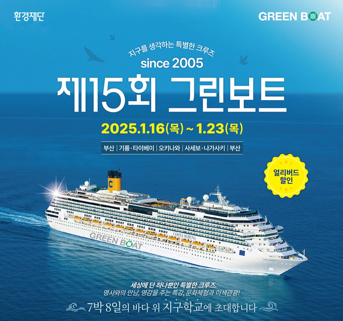 환경재단에서 운영하는 ‘그린보트’는 이러한 크루즈의 낭만에 환경을 주제로 한 학습과 교류의 의미를 더한 새로운 형태의 공익 프로젝트다. 선상에서는 환경 관련 전문가들의 강연과 문화예술 공연, 국제 연대 프로그램 등이 일정 내내 이루어진다. 참가자들은 바다라는 열린 공간 속에서 자연스럽게 서로의 경험과 생각을 나누고, 지구 공동체의 미래에 대해 더 깊이 고민하는 시간을 가질 수 있다고 한다.