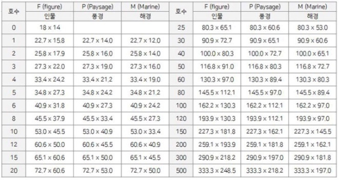 참고로 캔버스의 크기는 '호'로 불린다. 미술에 문외한이라도 OOO화가의 작품 OO호로 불리는 것을 들어봤을 것이다. 호수는 아래와 같다. 또 캔버스는 F형, P형, M형이 있는데 각각의 호수의 크기는 아래와 같다.