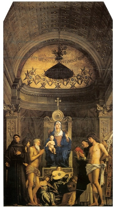 이 제단화에 등장하는 인물은 왼쪽부터 성 프란치스코, 세례자 요한, 성 욥(giobbe) 그리고 앉아서 음악을 연주하는 세 명의 천사, 그 옆으로 성 도미니크, 성 세바스찬, 툴루즈(toulouse)의 주교였던 성 루드비코입니다. 1493년에 완공된 산 지오베교회는 베네치아에 퍼진 흑사병의 형벌로부터 구원을 열망한 시민들이 욥 성인에게 봉헌한 교회입니다. 산 지오베교회는 청빈 정신을 강조하는 프란치스코회 소속의 교회로 가난하거나 병든 자들을 위한 사역을 하는 수도회였습니다. 그러니 당연히 지오베교회의 제단화에는 욥 성인과 프란체스코 성인의 모습이 그려져 있습니다.