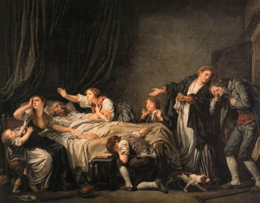 돌아온 아들의 발치엔 목발이 떨어져 있습니다. 부상을 당한 모양입니다. 아버지는 침상에 누워 있습니다. 딸과 아들들의 모습을 보니 아버지는 사망한 모양입니다. 어머니는 아들에게 무어라고 말하고 있는걸까요? 아들의 모습에서 참을 수 없는 후회를 읽을 수 있습니다. 당시의 사람들은 이 그림을 통해 무엇을 느꼈을까요? 지금의 관점으론 진부해 보이기는 하지만 삶이 가져야하는 기본적인 도덕성과 평범한 미덕을 숭고의 미로 승화시킨 그의 그림이 그 시대의 사람들의 마음을 흔들어 놓기엔 충분했었던것 같습니다.