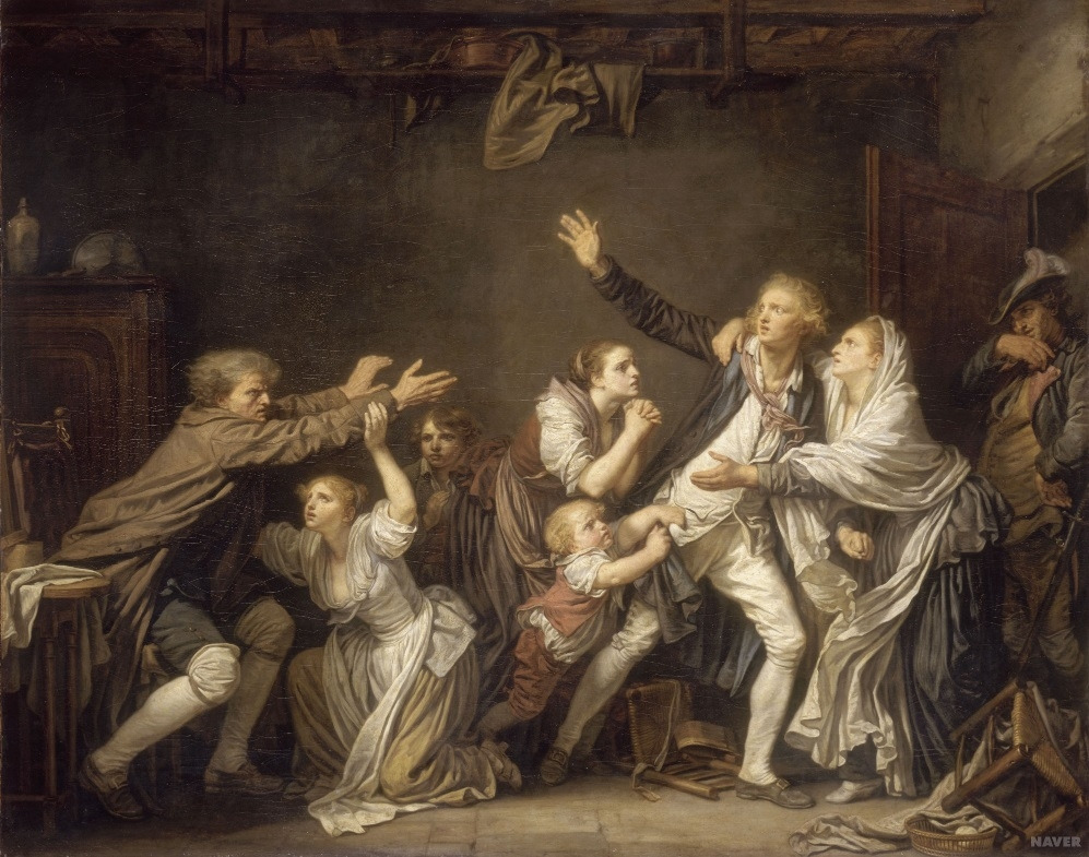위의 그림은 장 밥티스트 그뢰즈(Jean baptist Greuze, 1725~1805)가 그린 장르화로 그뢰즈는 프랑스 아카데미에서 최초의 장르화가로 인정받았습니다. 그뢰즈 또한 역사화가가 되기 위해 많은 노력을 하던 중 그의 장르화가 인기를 얻게 되면서 명성을 얻게 됩니다. 평범한 시민들의 삶속에서 길어올린 도덕적 교훈을 전달하기 위해 그뢰즈는 숭고한 역사화에 나오는 인물들과 같이 과장된 포즈로 인물들을 그렸습니다. 그의 그림이 던지는 교조적인 설교에도 관람객들은 눈물을 흘리며 감동했습니다. 그 이유는 마침 중산층에게 사회적으로 도덕성이 요구되는 시기였고 상류층과 지식인들 사이에서 유행하던 로코코 미술양식에 대한 반발심때문이기도 했습니다. 그뢰즈가 "덕의 화가, 타락한 도덕의 구원자"라고 불린 이유가 여기에 있습니다.