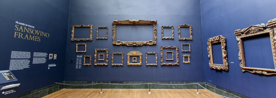 바로 액자입니다. 그중에서도 '산소비노 액자(Sansovino Frames)'라고 불리는 것이지요. 아래의 사진을 보면 조금 생경한 모습이라 당황스럽겠지만 실제 런던 내셔널갤러리에서 진행된 전시 모습입니다.