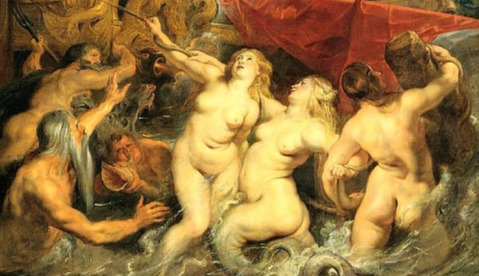 캔버스의 하단에 그려진 많은 인물들을 보자. 루벤스의 전매 특허인 풍만하고 생동감 넘치는 세 명의 누드 여인은 바다의 요정 네레이드다. 가운데 있는 여인의 다리에 연결된 인어의 꼬리가 파도 사이로 보인다. 네레이드들은 배를 정박하기 위한 밧줄을 잡고 선착장을 떠받치며 마리의 안전한 하선을 돕고 있다. 마리의 항해를 도운 이들은 또 있다. 삼지창을 든 바다의 신 포세이돈이 뱃머리를 붙잡고 있다. 그 아래 은빛 긴 턱수염을 가진 프로테우스가 보인다. 포세이돈의 부하이자 미래를 알고 있는 프로테우스는 만물을 변화시키는 존재다. 마리가 프랑스를 변화시킬 존재라는 것을 암시한다. 그 아래서 뿔고동을 부는 인물은 포세이돈의 아들 트리톤이다.