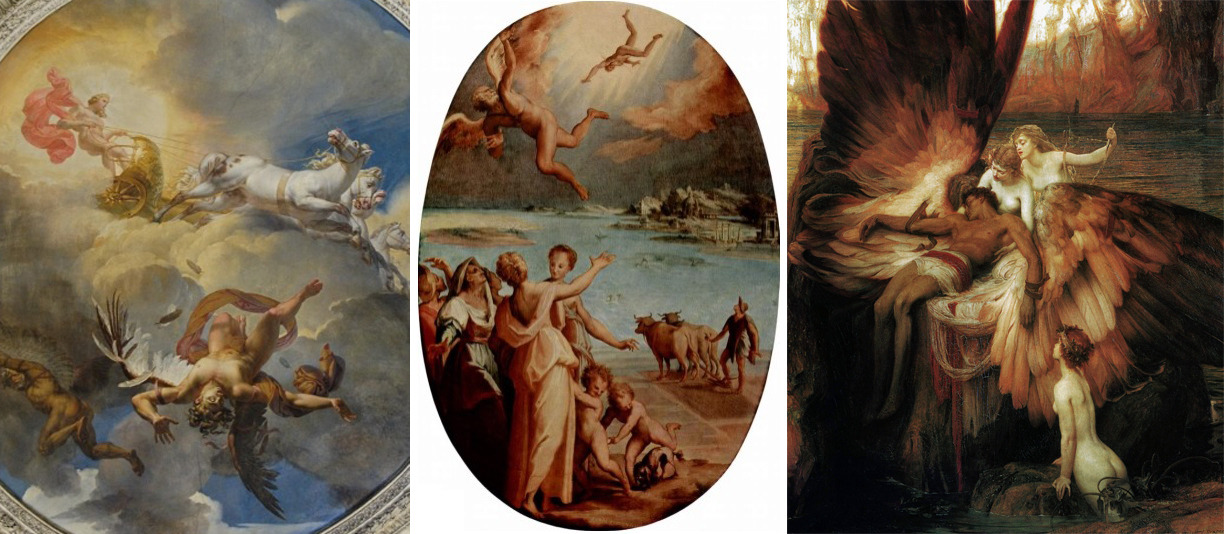 왼쪽의 그림은 메리 조제프 블롱델이 1819년 그린 루브르 박물관의 아폴로 원형 천장 채색화이고, 중앙의 그림은 만추올리가 1570년에 그린 이카루스의 추락, 오른쪽의 그림은 허버트 제임스 드레이퍼가 1898년 그린 이카루스를 위한 탄식이다.