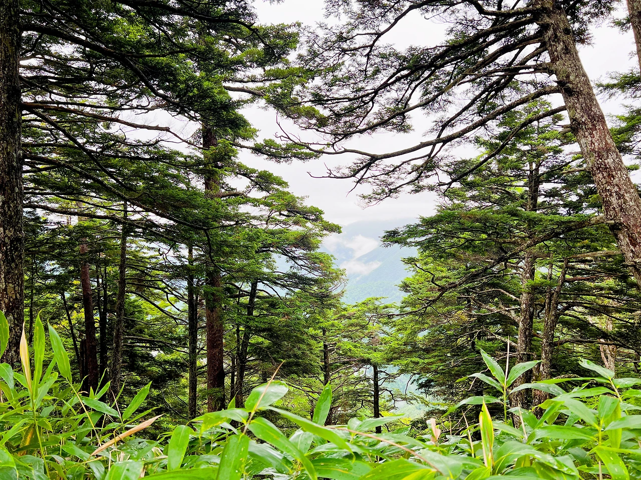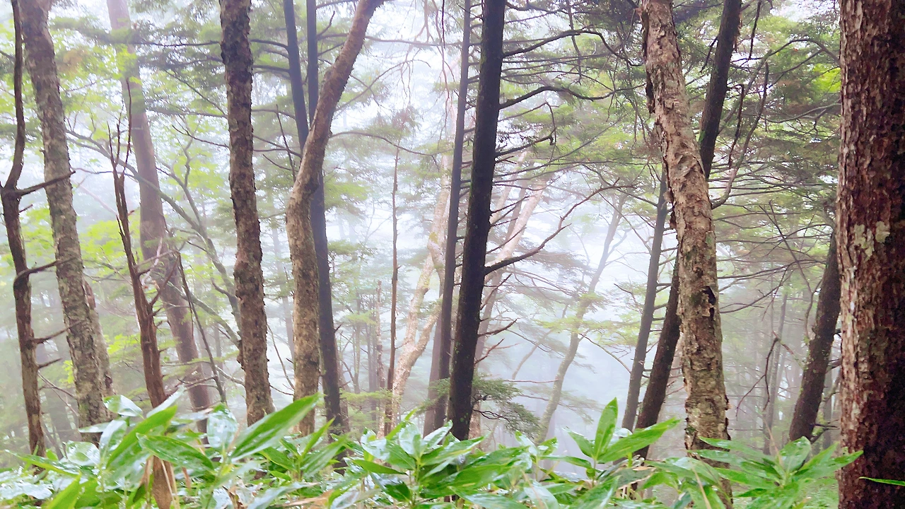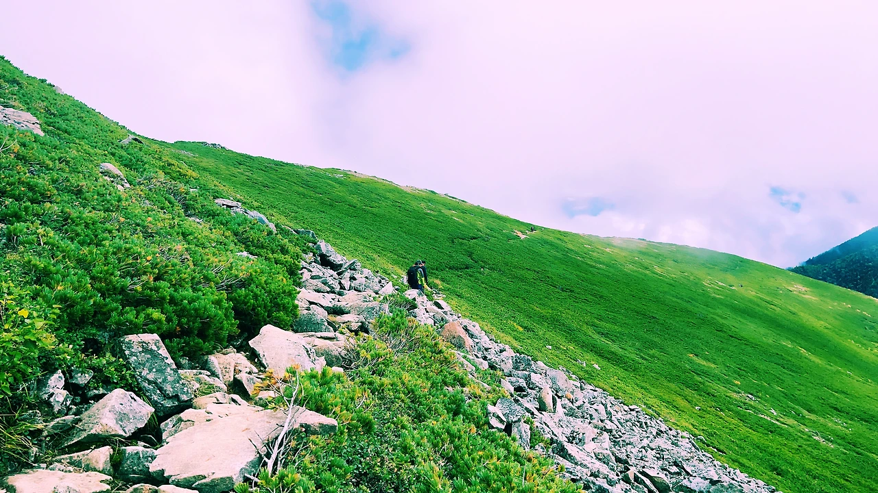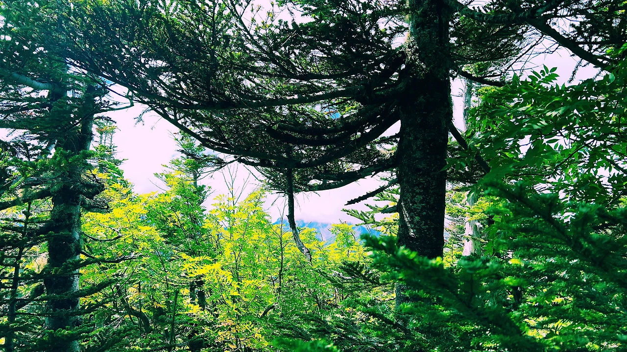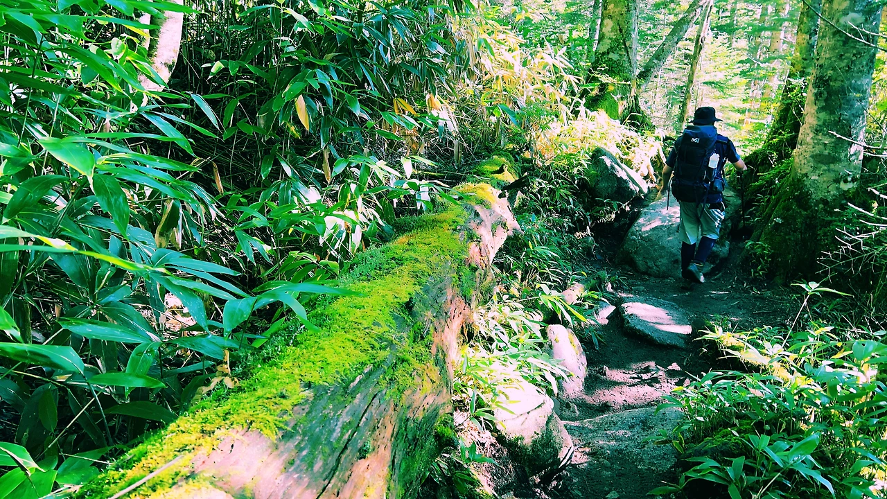 중간에 보이는 산장이 바로 조넨고야입니다. 사실 지척에 있는것 같은데 이곳에서 산장까지 약 한시간 정도 걸린듯합니다. 다만 고도가 낮아지면서 다른 식생구역이 나타나며 힐링포인트가 되어주네요.