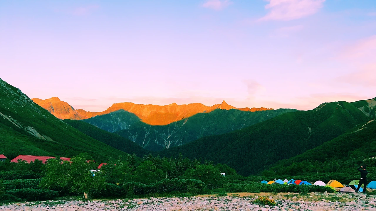 일출반대방향의 산장과 알프스의 고봉들이 햇볕을 맞이하는 모습이 인상적입니다. 멀리 빼쪽하게 솟은 3180m의 야리가타케(槍ヶ岳)도 언젠가 도전하고 싶네요.