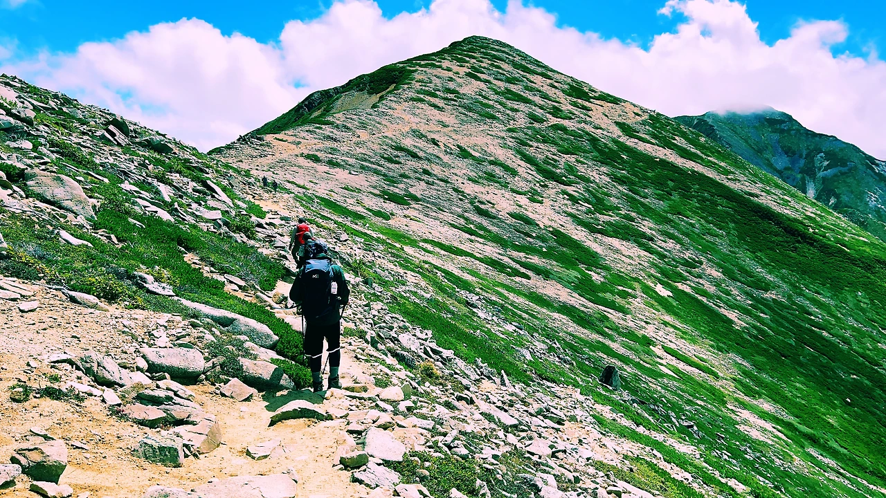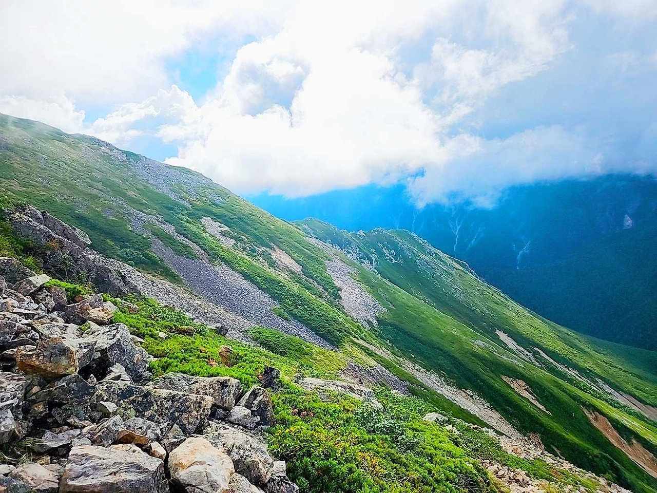 라이쵸를 뒤로하고 조넨고야까지의 코스입니다만 날씨도 개면서 바람도 거세졌지만 정말 키타알프스의 장관이 눈앞에 펼쳐집니다. 시간이 느리게 가길 바라며 한장면 한장면 사진으로도 마음속으로도 새겨봅니다. 전 일부러 코스뒤에서 제 페이스로 마음껏 심호흡하면서 한걸음 한걸음 즐긴 감동의 순간이었습니다.