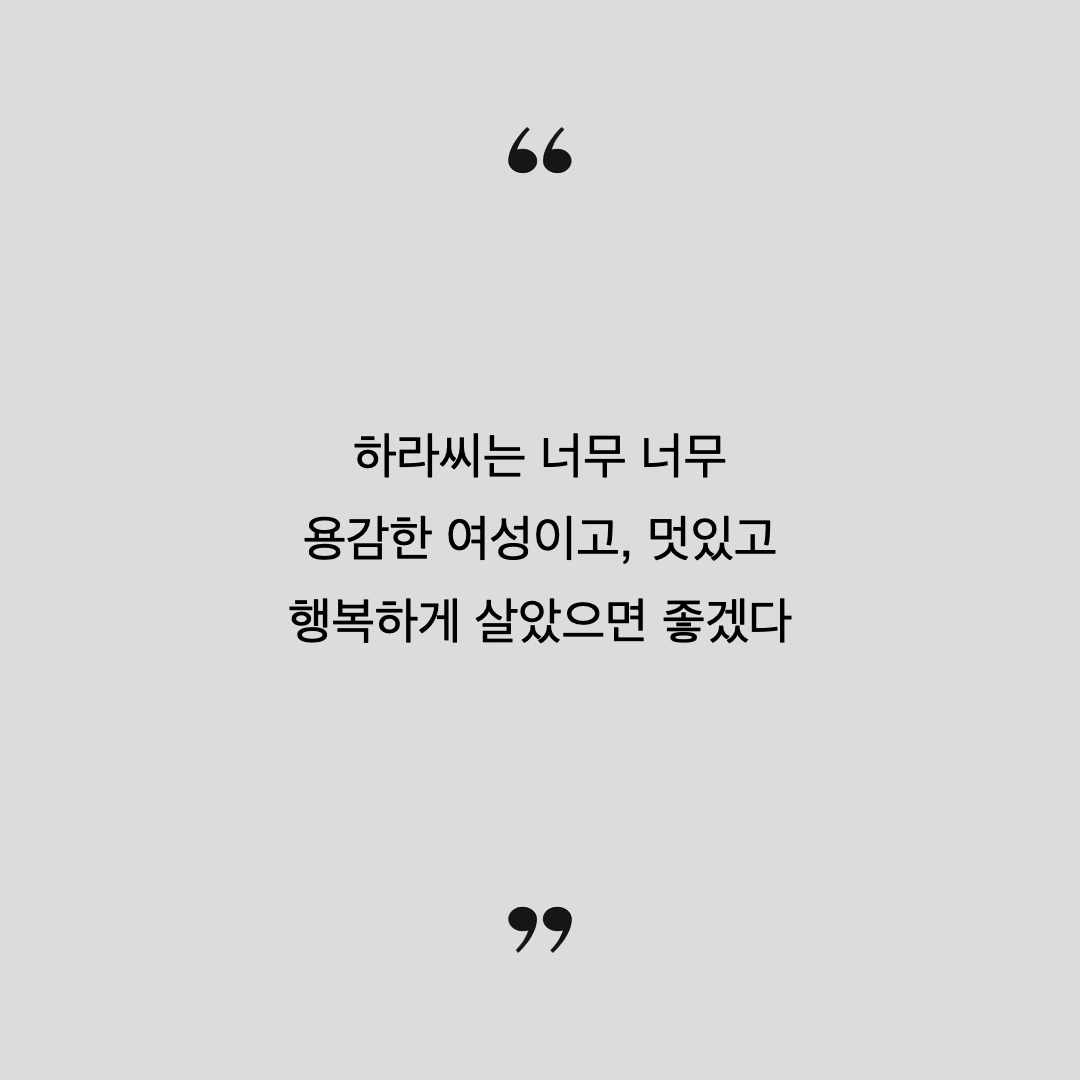 지금도 ‘불법 촬영’ ’성폭행‘ ’교제 폭행 사망‘ ‘n번방'을 검색하면 거의 매일 끊임없이 뉴스가 쏟아져 나온다. 도처에 성범죄가 도사리는 오늘을 사는 모든 구하라가 용감하고 멋진 여성으로 행복하게 살았으면 좋겠다. 쓰레기들보다 오래 더 행복하게 살았으면 좋겠다.