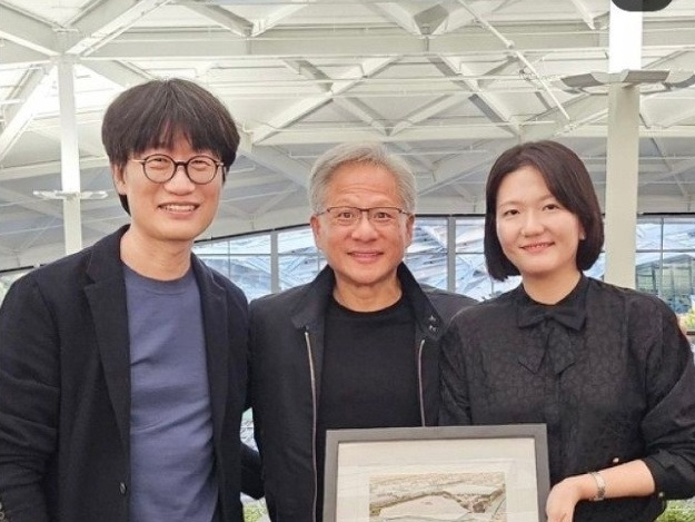 지난 5월 미국 엔비디아 본사에서 만난 네이버 창업자인 이해진 글로벌투자책임자(GIO)와 젠슨 황 엔비디아 CEO, 최수연 네이버 대표. 네이버 창업자인 이 의장까지 나선 이 쓰리