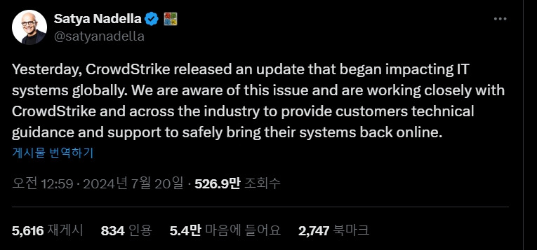 별개로 X(옛 트위터)의 파급력은 이번에도 확인됐다. 샤티아 나델라 마이크로소프트 CEO가 X를 통해 공지를 올렸다. '우리는 문제를 알고 있으며 크라우드스트라이크와 업계 전반에 걸쳐 긴밀히 협력해 시스템을 안전하게 온라인 상태로 되돌리기 위한 기술 지침과 지원을 제공한다'는 내용의 트윗은 조회수 526만을 넘겼다.