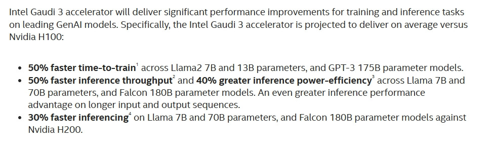 *엔비디아 H100 대비 라마(Llama2) 70억 & 130억 매개변수, GPT-3 1750억 매개변수 모델에서 학습 시간 50% 단축. 라마 70억 & 700억 매개변수 모델에서 50% 빠른 추론 처리량과 40% 향상된 추론 전력 효율