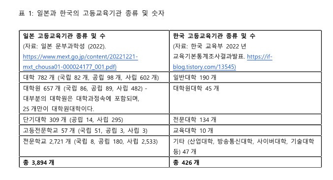일본의 고등교육 기관은 다양한 종류가 있다. 대학 (4년제, 의대는 6년제), 단기대학 (한국의 전문대학, 2-3년제), 전문학교 (2-3년제), 고등 전문학교 (5년 제로 유학생은 3년째부터 입학가능), 대학원 (석, 박사과정) 등이 외국인 유학생의 입학이 가능한 종류이다. 이에 더하여 2019년부터 신설되어 실용 기술을 중심으로 가르치는 4년 제인 전문직 대학이 있다. 여기서 한국과 유사한 점은 4년제 대학과 단기대학이 주가 되는 구조와, 국공립에 비하여 사립대학의 비율이 월등히 높다는 점이다. 표 1은 일본과 한국의 고등교육기관의 종류와 숫자를 보여준다.