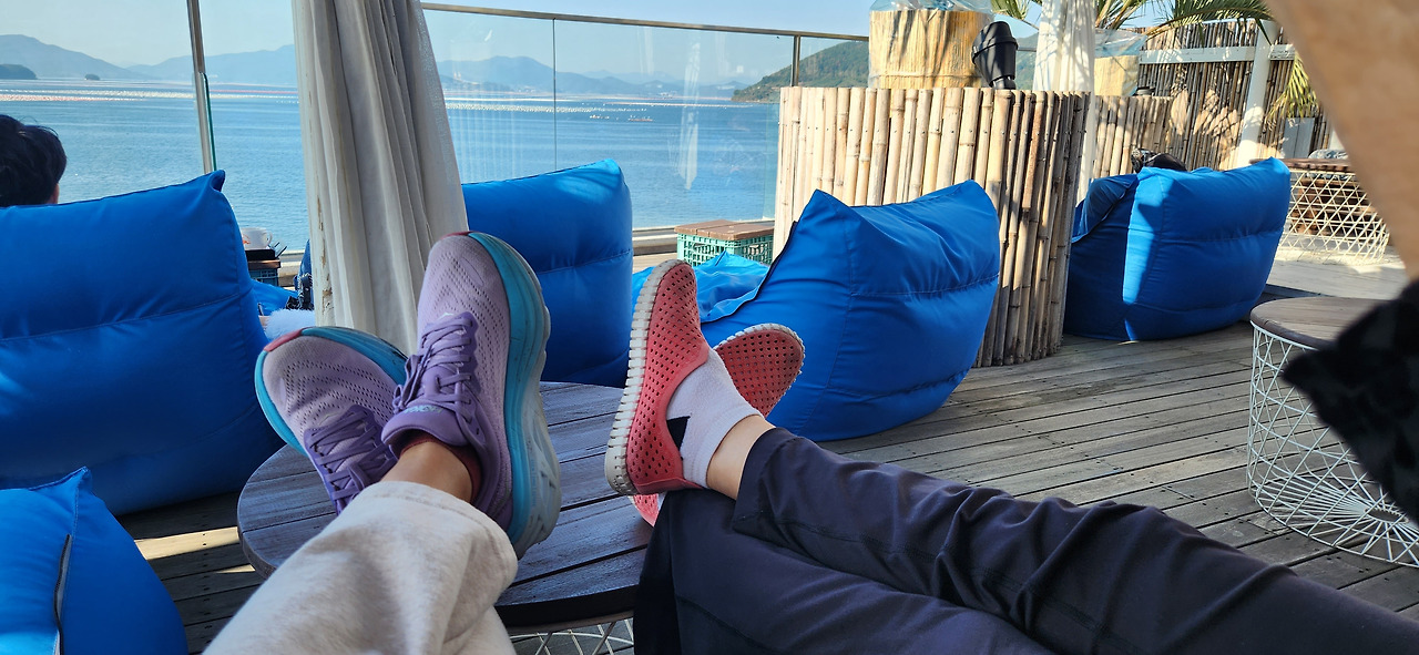 내가 사는 거제면에서 가까운 동부면에 위치한 오송웨이브는 우리가 자주 가는 카페이다. 이 카페 역시 인스타그램용 사진을 찍기에 멋진 장소들이 많다. 우리는 춥거나 비가 올 때는 카페 안쪽에 자리를 잡지만, 대개는 베란다나 잔디밭 쪽의 의자에 앉아 먼바다를 보며 차와 함께 이 카페의 맛있는 빵을 먹는다. 운이 좋아 인기 있는 잔디밭의 빈백 소파에 앉게 되면 1-2시간 여유롭게 책도 보고 얘기도 나누며 시간을 보낸다.