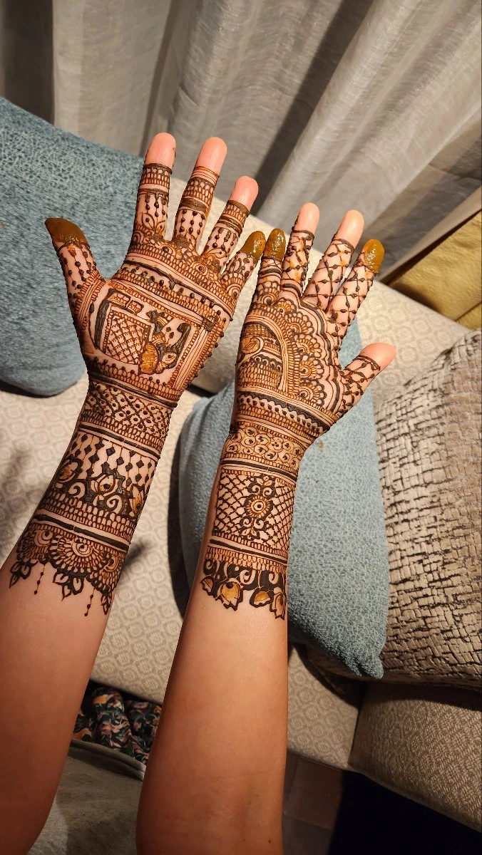 내 양손에 한 메헨디 디자인으로 디자이너가 즉석에서 그림 없이 하였음. 놀라운 솜씨!