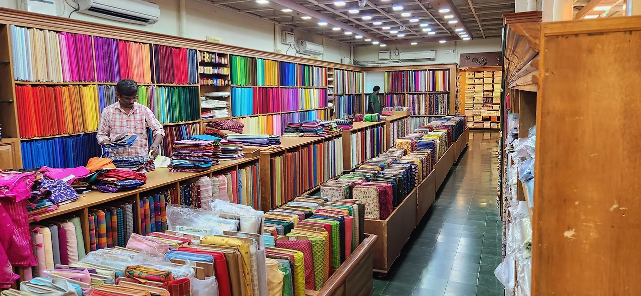 결혼식 당일, 신부는 인도의 전통 의상인 사리 (saree)를 입고, 신랑은 쿠르타 (kurta)와 도티 (dhoti)를 입는다. 인도 남부에서는 터번이나 모자는 안 쓰는 것 같았고, 신랑 신부 모두 맨발이었다. 신부의 사리와 장식들은 매우 화려하였다. 사리와 장식들은 결혼식 용품을 파는 부티크가 많이 있어서, 예산과 선호에 맞추어 살 수 있는 것 같았다. 아래는 우리가 간 부티크의 한 층을 보여주는 사진이다. 신부와 나의 비싼 실크 사리는 신랑의 부모님이 준비해 주었으며, 나머지는 이 부티크에서 샀는데, 화려한 장식들이며 신랑의 쿠르타와 도티 등등을 모두 합쳐 약 30만 원 돈에 살 수 있었다. 인도 기준으로도 그리 비싼 것은 아니라고 했다.