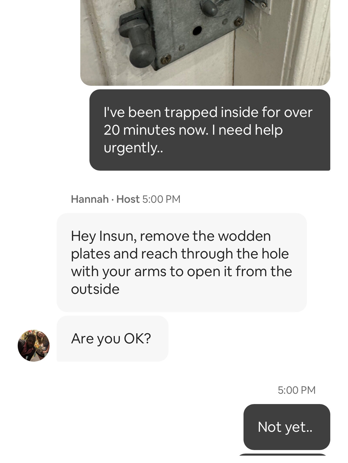 첫 메시지에 답이 없어, 거듭 SOS메시지를 보낸 결과 화장실 셀프감금 50여분 만에 집주인의 회신이 왔다.