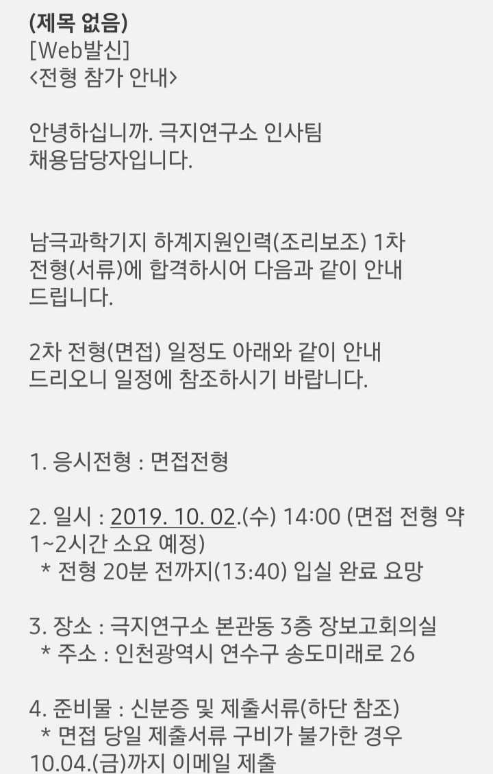 9월 중순쯤 지원했고, 10월 초에 합격 안내문자를 받아 면접에 참여했습니다. 면접 장소는 인천에 있는 극지연구소로, 집에서 대중교통으로 왕복 5시간정도 걸리는 곳이었습니다. 시설도 좋았지만 경비가 꽤나 삼엄한 곳이었던게 인상깊었습니다.