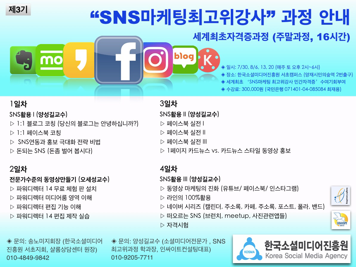 홍보의 중심축이 소셜미디어로 급격히 이동하면서 제대로 소셜미디어를 배우고자 하는 분들이 점점 많아지고 있습니다. 분명한것은 용감하게 그냥 소셜미디어를 사용하는것 보다 체계적으로 배우고 나면 방문자수도 늘고 홍보 마케팅의 효과도 급증한다는 겁니다.