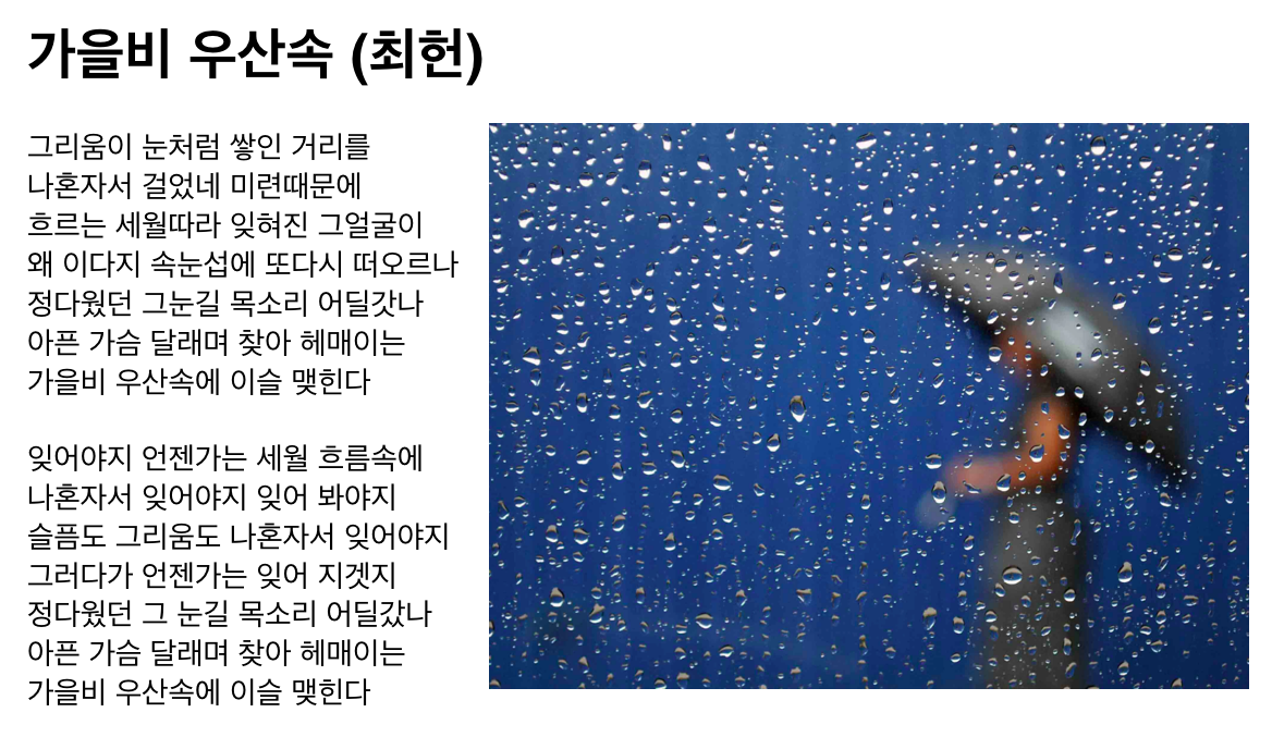 가을엔 사랑하게 하소서http://naver.me/FjkcpkWz가을비 우산속에 맺히는 이슬...아픈가슴 달래며 찾아헤메는 여인...정다웠던 그눈길 떠올리며 두눈 꼬옥감는 여인...슬픔도 그리움도 혼자서 잊어야 하나요?가을엔 사랑하세요.