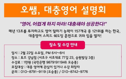대충영어 학습법 설명회가 강남역 토즈에서 열립니다.