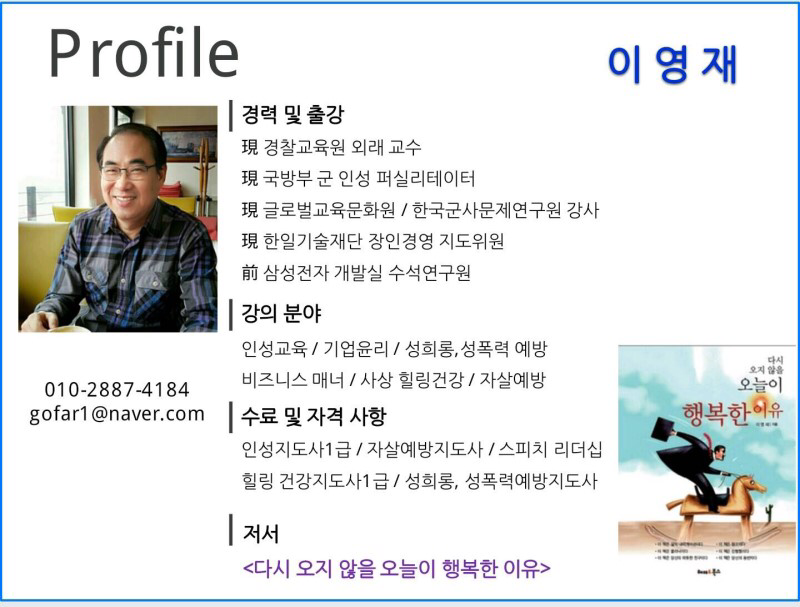 군부대 및 경찰에서 인성교육을 전문으로 강의하는 이영재 명강사를 만났습니다.