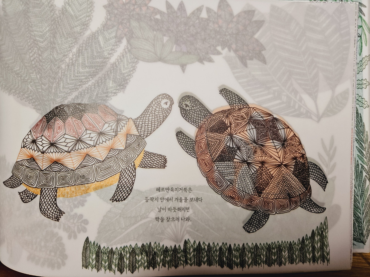 다양한 동물들이 저마다의 방식으로 어떻게 생기고 태어나 자라는지를 이야기하는 이 책은 이들의 신비로운 탄생/성장 과정을 아름다운 구성 방식과 그림으로 풀어내 더욱 가슴을 따뜻하게 만든다. 한 장의 그림 위에 덧대어진 얇은 트래싱지(기름종이라 말해온)를 덮고 넘길 때마다 생명 성장 과정들이 한 장면, 한 장면 펼쳐진다. 제작이 까다로워 수작업 비율이 절대적으로 높다는 이 책은, 그렇기에 창작자나 만드는 이들의 정성이 책을 통해 절로 느껴지기도 한다. 책 속 내용만 따지자면야 초등학교 2학년 아이에게는 다소 싱거울 수도 있을 것 같았지만 책 전체의 아름다움이 좋아 며칠 후인 내 생일 셀프 선물로 구입했는데, 집에 도착한 책을 아이와 함께 보고나니 "엄마, 이 책은 예쁜데 재밌기도 하네."라며 아이도 한참을 조심스레 페이지를 넘긴다.