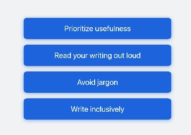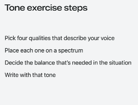 사례로 애플이 어조 Tone을 어떻게 설정하는지 살펴봤지만, 사실 잘 만들어진 UX 라이팅을 보다가 실제로 해보려고 하면 막히는 경우가 많을 것이다. 사실 어조란 매우 섬세한 것이어서 이를 설정하는 것이 처음부터 잘 되기는 어렵다. 이에 애플 UX writer는 아래와 같은 연습 단계 가이드를 제시한다.