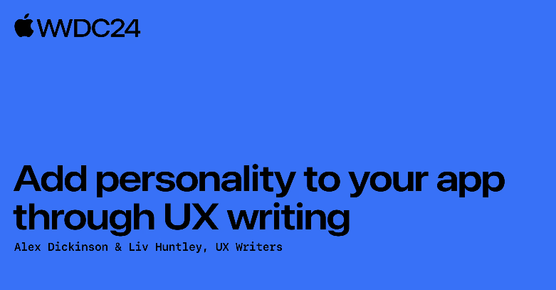 오늘은 애플 개발자 컨퍼런스 2024 WWDC24에서 있었던 애플 UX writer 두 명의 키노트 발표 내용을 정리해두려고 한다. UX 라이팅에 관심 많으신 사람(나)는 그냥 지나칠 수 없는 발표라서 꼼꼼히 리뷰해보겠다.