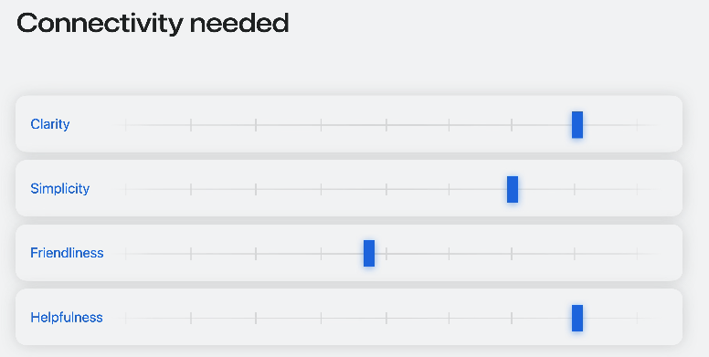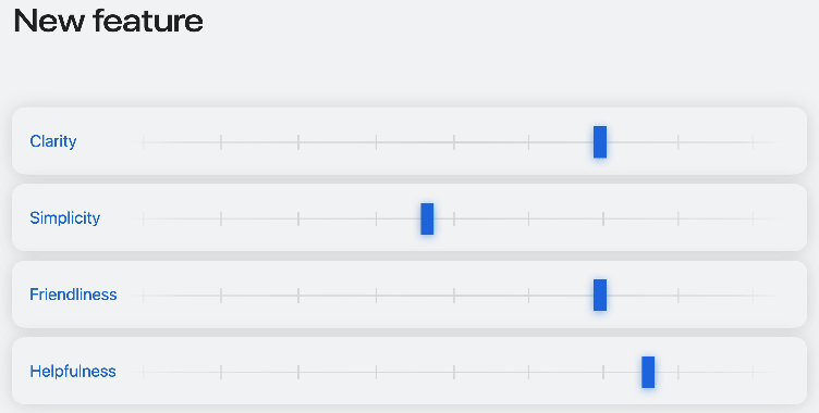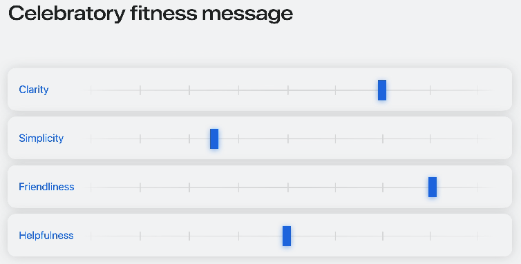 건강 앱에서 운동 목표 달성을 축하하는 메시지의 경우, 애플에서 설정한 4가지 목소리 명확성 Clarity, 단순함 Simplicity, 친근함 Friendilness , 유용함 Helpfulness 의 척도를 위와 같이 설정하고 이에 맞춰서 어조를 설정한다. 따라서 친근감이 강하게 느껴지고, 단순함과 유용함은 적게 느껴지는 어조로 사용자의 운동 코치처럼 UX 라이팅이 디자인된다.