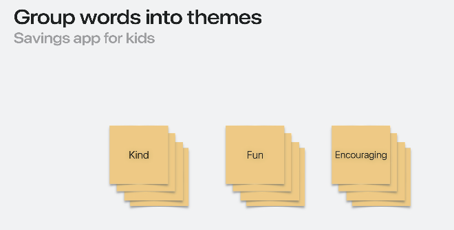 최대한 많이 앱을 상상하며 적은 단어들, 펼쳐진 단어 카드들을 보면서 범주화를 해서 대표단어를 선정한다.단어를 분류해 주요 키워드 그룹화를 하고 핵심 속성을 도출하여 앱의 목소리 정의하는 것이다. 이때 꼭 스티키노트, 포스트잇, 메모지와 같은 형태를 사용하기를 권고한다. 아이데이션에 도움이 되어서 그럴 것이다.