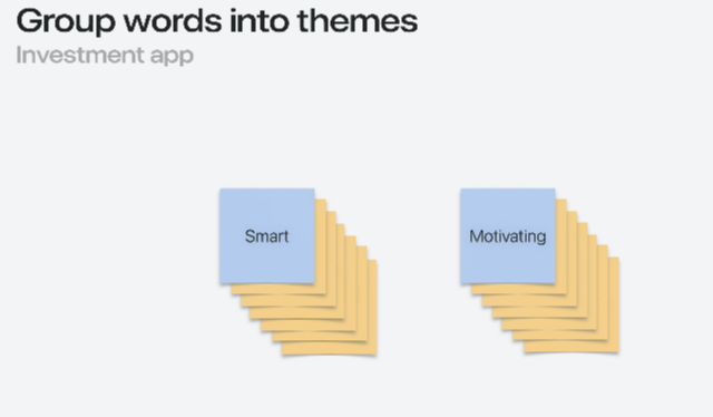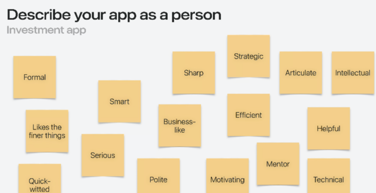 투자앱을 예시로 UX 라이팅을 어떻게 발전시켜 나갈 수 있는지 살펴보자. 아이데이션을 충분히 하는 것이 중요하다. 투자앱을 사람으로 생각하고 그 사람(앱)의 성격을 설명할 수 있는 단어를 최대한 많이 적어서 자유롭게 펼쳐둔다.