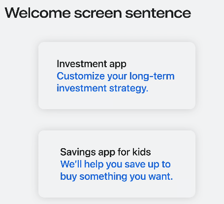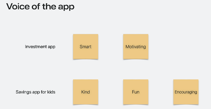 앱의 제1의 목표, 유저 핵심 동기를 써보면서 UX 라이팅을 시작한다. 투자앱의 경우 돈모으기 Save your mony 에서 점점 발전시켜나가게 되는데 어른용 투자앱과 아이용 투자앱의 발전과정은 아래와 같다.