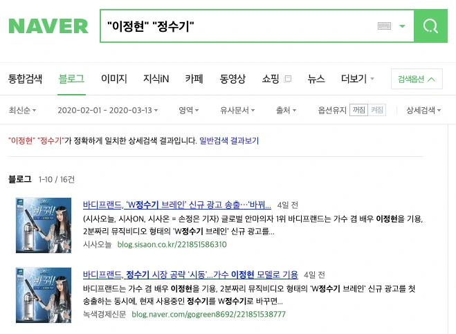 메인 광고가 나온 3월 14-15일 주말 이전에 '이정현 정수기'라는 검색어에 상응하는 네이버 블로그 콘텐츠는 단 2개, 그것 또한 블로거가 작성한 콘텐츠가 아닌 신문사에서 복붙으로 만든 기사라는 것인데요.