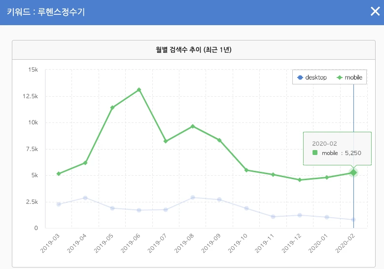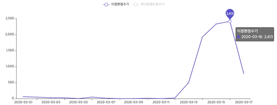 바디프렌드 정수기 검색량이 정점을 찍었던 3월 15일에는 89건 이었으며(이정도면 마케팅 담당자 좀 혼나야 ㅠㅠ 더 심한 건... 그 이후로 검색량은 더 줄고 있다는 것...), '이정현 정수기'는 2,413건으로 27배가 넘는 차이를 보이고 있으니 말이죠.