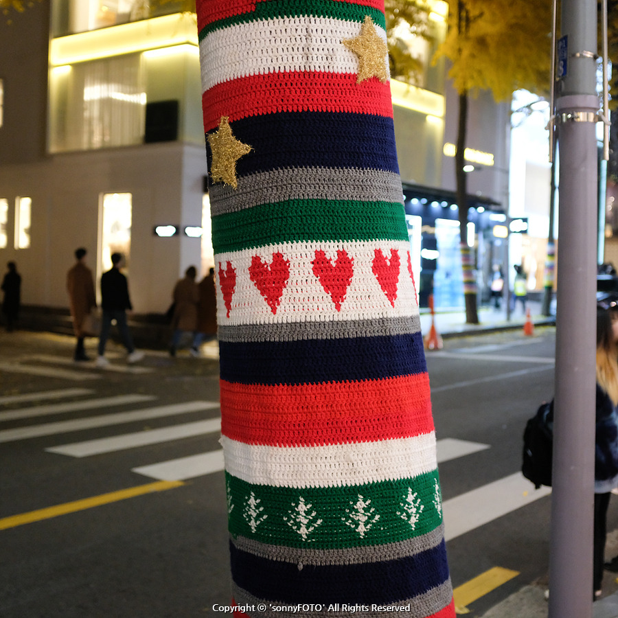 병충해를 방지하기 위한 방법 중에 하나지만, 서울시는 외국인이 많이 오는 압구정 가로수길이라는 특별함과 디자인적인 요소를 위해 크리스마스 느낌 가득한 덮개를 만들어 준 것 같네요.