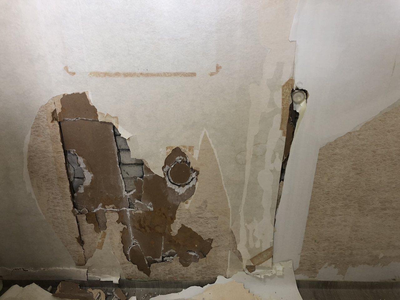 "벽지를 뜯어보니까 벽이 너무 낡아서 다 부서졌어요. 목공작업을 먼저 하셔야 할 것 같아요."
