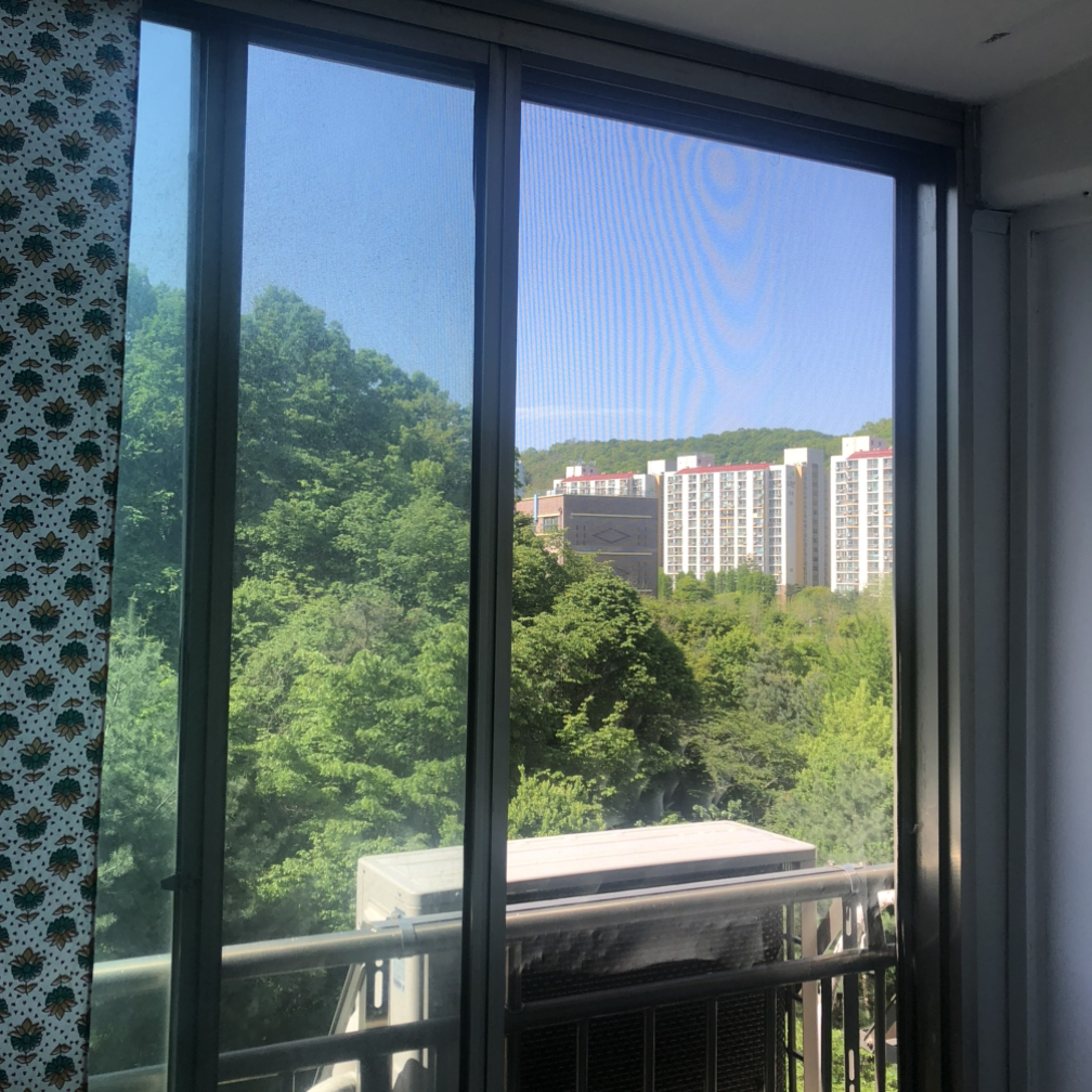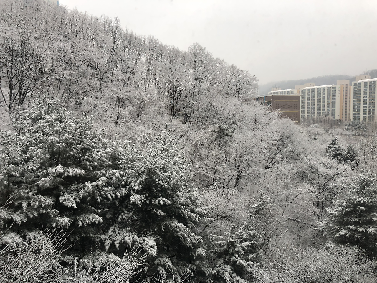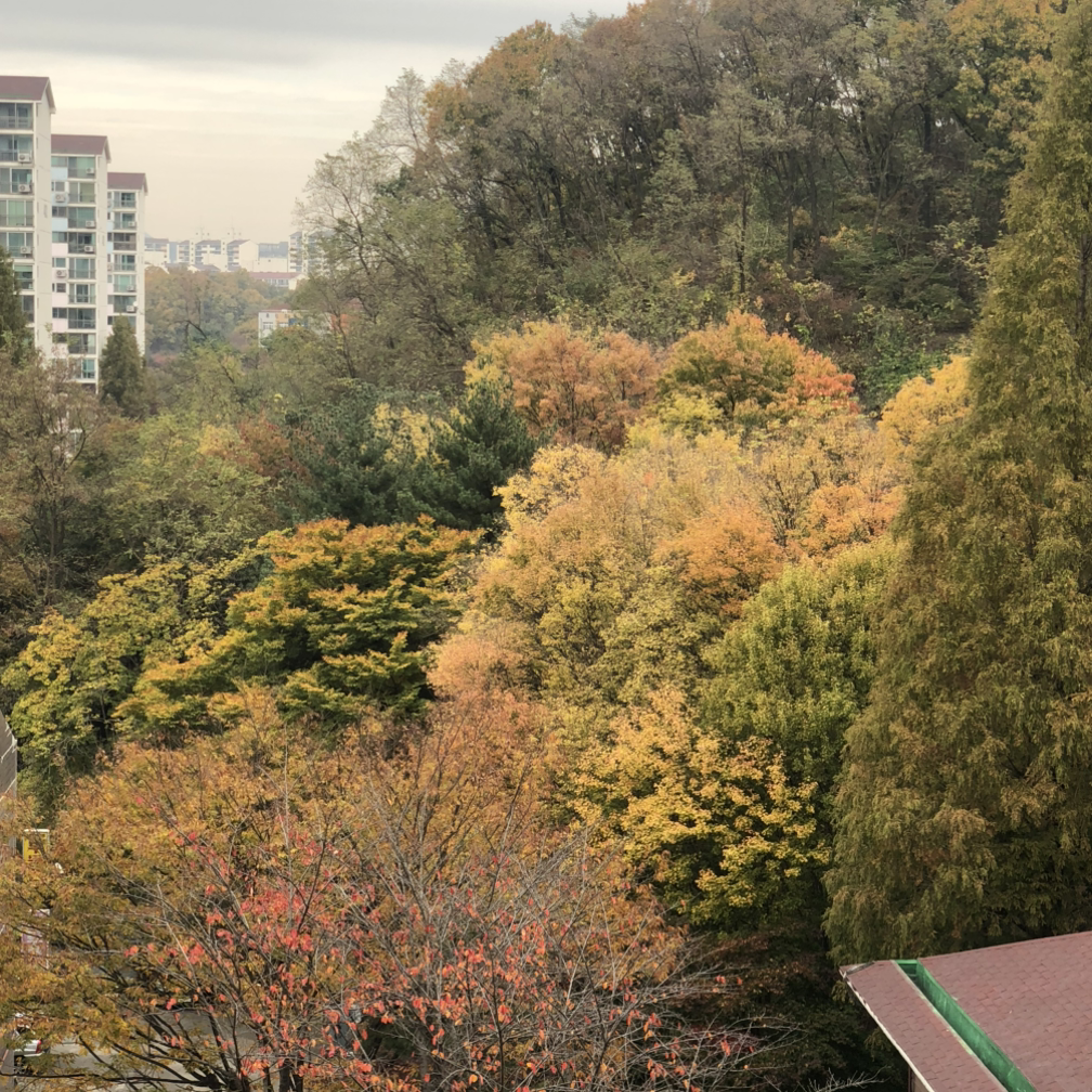 창문 없는 복도식 아파트라서 누릴 수 있는 기쁨도 있었다. 아침에 집을 나설 때면 현관문을 열자마자 탁 트인 하늘과 멋들어진 산줄기, 알록달록 나무들이 눈앞에 선명했다. 집으로 돌아올 때도 복도를 걸으며 하루가 저물어가는 풍경에 매일 감탄하기 바빴다. 비가 오는 날에는 산에 걸쳐진 안개가 운치 있었고 비에 젖은 나무냄새가 코로 훅 들어왔다. 눈이 오면 황홀경에 빠졌다. 물론 단점도 있었다. 여름이면 집게벌레처럼 생긴 친구가 복도를 기어 다녔고 집으로 들어오지 못하게 방어전을 펼쳐야 했다. 하지만 자연을 가까이에서 누리는 기쁨이 그 모든 걸 상쇄하고도 남았다.