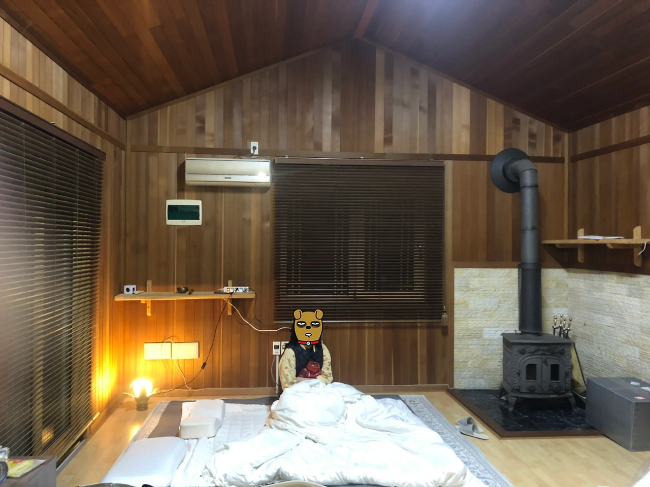 멋스럽게 보였던 나무 천장이 진드기 집으로 보였다. 당장 당근 어플을 켜서 난방텐트를 검색했고 운 좋게 귀여운 난방텐트를 나눔 받았다. 방이 따로 없는 오두막 집에서 난방텐트는 우리의 아늑한 침실이 되어주었다.