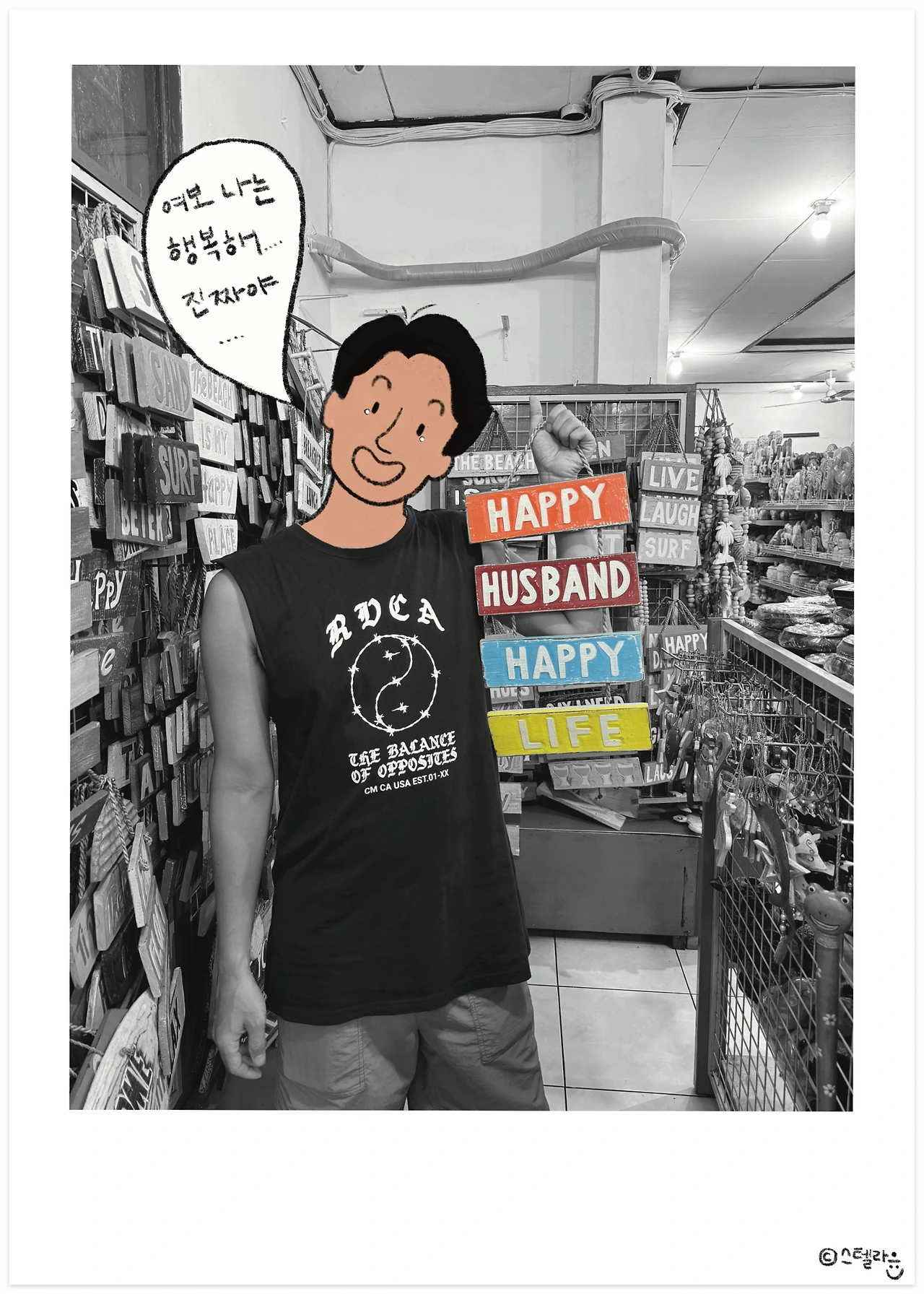 어딜 가든 늘 팬티 몇 장, 양말 몇 켤레, 티셔츠 한 두장, 바지 한 개 정도면 끝이다. "여보 칫솔은 안 챙겨?" 물으면 그제야 "아 맞다!" 하며 물 묻은 칫솔을 달랑 가져다가 슬쩍 가방에 넣는다. 작년 발리 여행에서도 대부분의 옷을 현지에서 몇 천 원씩 주고 사 입었다.
