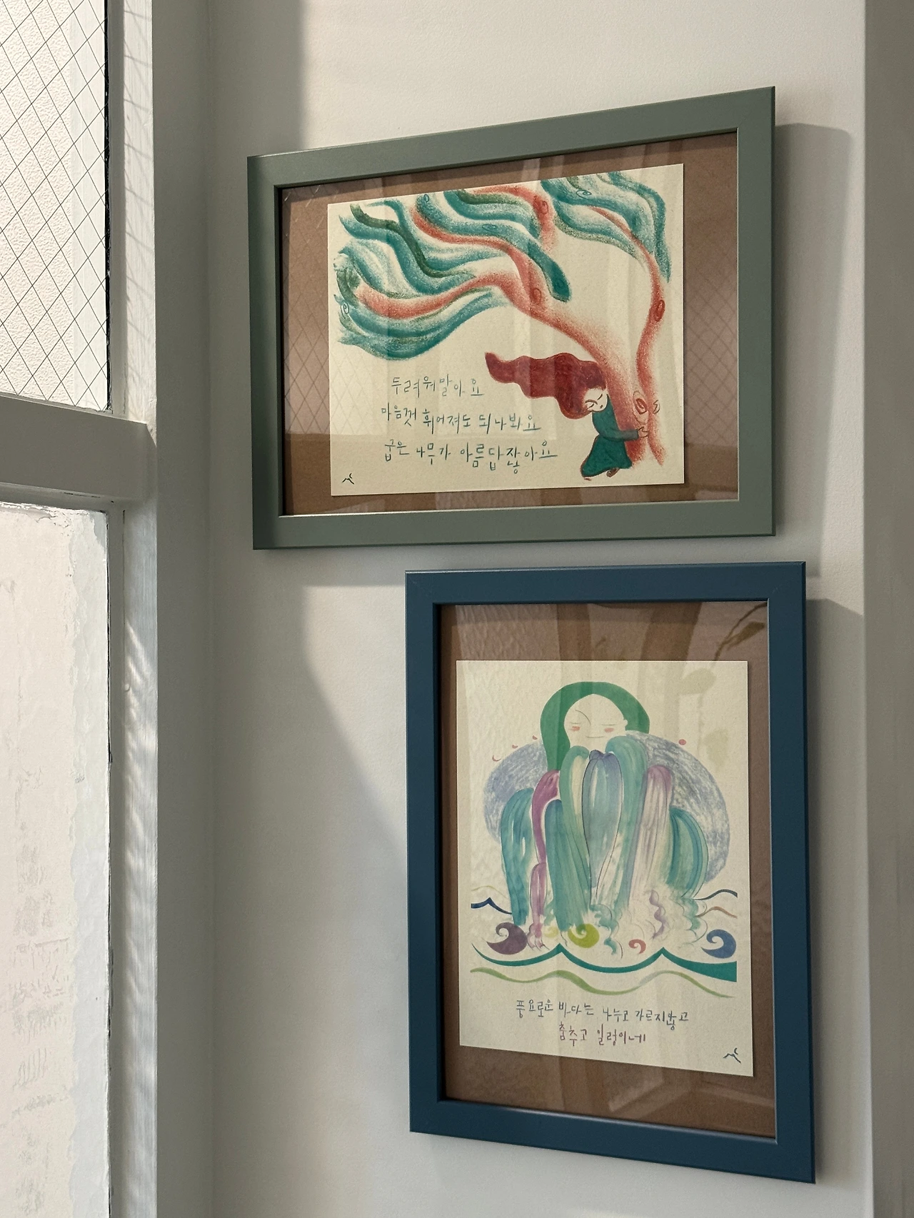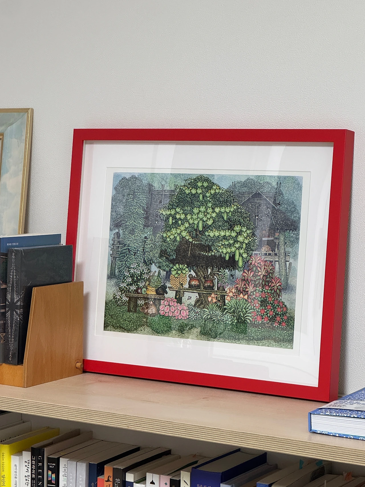 남의 집에는 액자를 걸지도 못했고 자가에 살면서도 언제 이사 갈지 모르는 임시 집이라는 생각에 액자를 걸기가 망설여졌다. 액자에 끼우면 부피가 커지니 마음에 드는 그림을 사놓고도 서랍 속에 넣어두기만 했다. 이사 오고 드디어 몇 년 동안 고이고이 모아 온 그림들을 모두 액자에 넣었다. 그림을 꼭 맞는 액자에 넣을 때의 짜릿함, 이거야 말로 소소하고 확실한 기쁨이다.