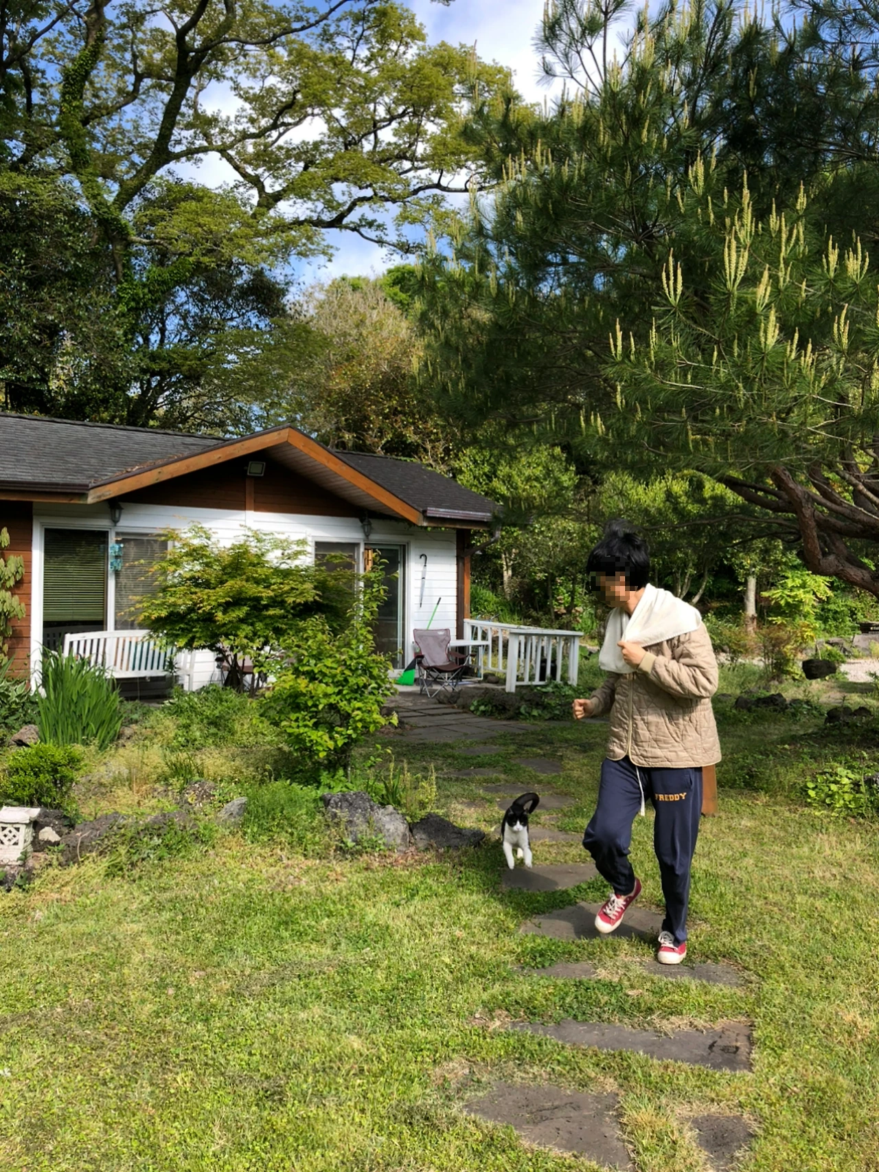 "하하. 저희 집에도 자주 와요. 간식 먹고 놀고 낮잠 자고 그래요. 몇 달 됐어요."