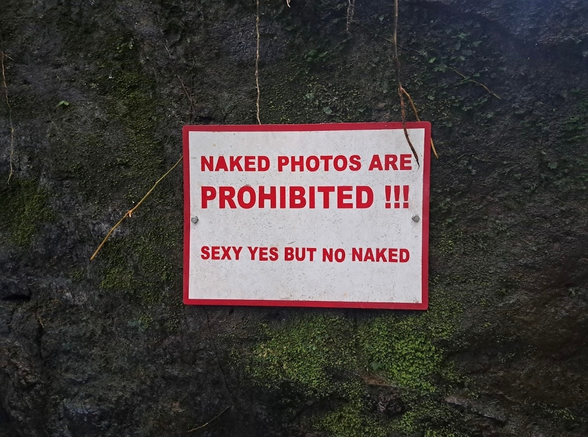 발리 우붓의 폭포 앞에 붙어 있던 경고장. 아무리 자유로운 발리라 해도 기본적인 매너는 지켜야 한다. 발리 사람들도 여행자들이 아무 데서나 웃통을 훌렁훌렁 벗거나, 나체로 수영하는 걸 반기지 않는다.